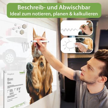 Auf der glatten Glasoberfläche lassen sich Termine, Rezepte oder Notizen ganz einfach mit Kreidestiften festhalten und rückstandslos entfernen. Starke Neodym-Magnete halten Ihre wichtigsten Erinnerungen sicher an Ort und Stelle. So entsteht Ihre ganz persönliche Ideenwand - jeden Tag neu.