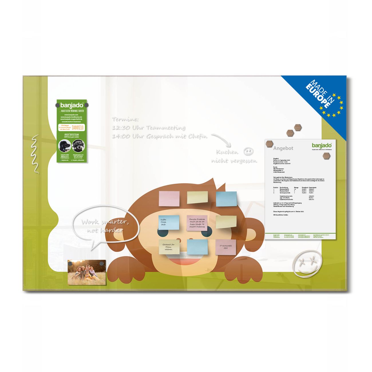 Ein Stück Design, das Ihren Alltag organisiert. Schreiben, heften, inspirieren - alles an einem Ort. Qualität, die man spürt. Montage leicht gemacht. Handwerk mit Herz - veredelt in Sachsen. Einzigartiges Design mit Motiv Motiv Fröhlicher Affe Beschreibbare Glasoberfläche, leicht zu reinigen Starke Magnetkraft durch Stahlrückwand Inklusive 4 Neodym-Magneten Flexible Montageoptionen Handveredelt in Sachsen - Qualität, die bleibt