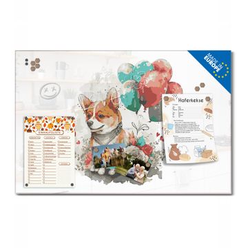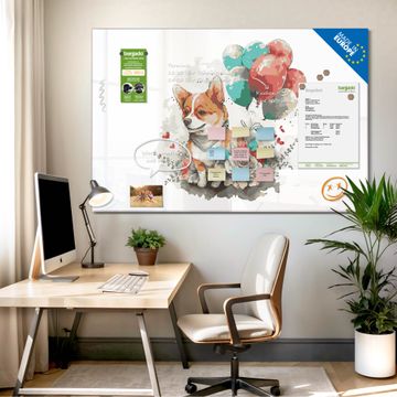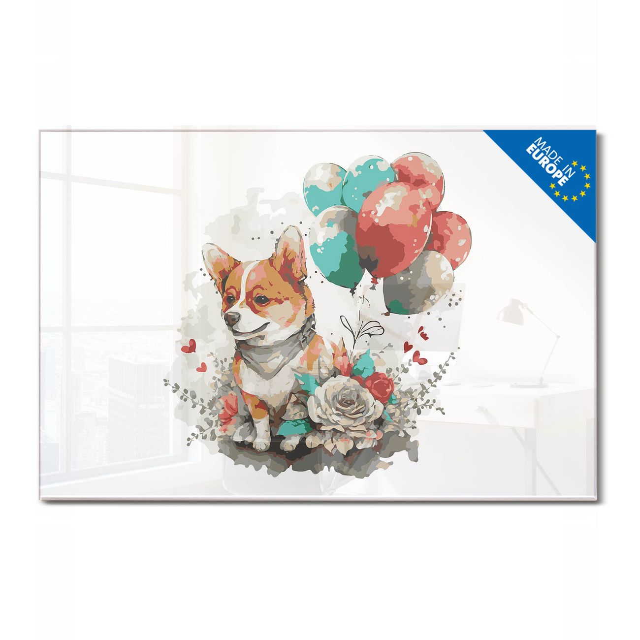Glas Magnettafel im Querformat Motiv Fröhlicher Corgi mit Ballons