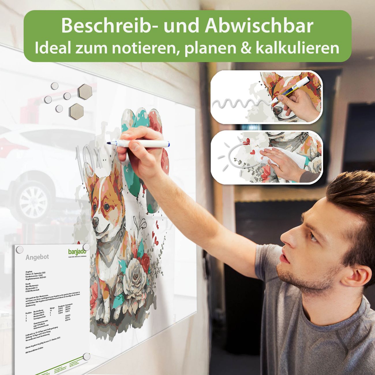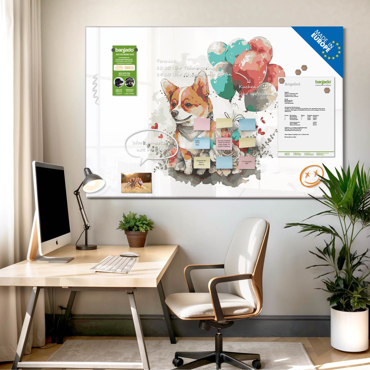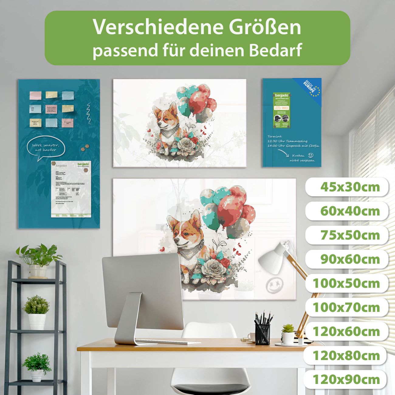 Die banjado Glas Magnettafel mit dem Motiv Motiv Fröhlicher Corgi mit Ballons verbindet Funktionalität mit Stil. Sie ersetzt das Zettelchaos durch klare Strukturen und bringt dabei eine warme, natürliche Atmosphäre in Ihr Zuhause. Ob im Büro, in der Küche oder im Eingangsbereich - dieses Design-Board zieht Blicke an und sorgt für Ordnung mit Charakter.