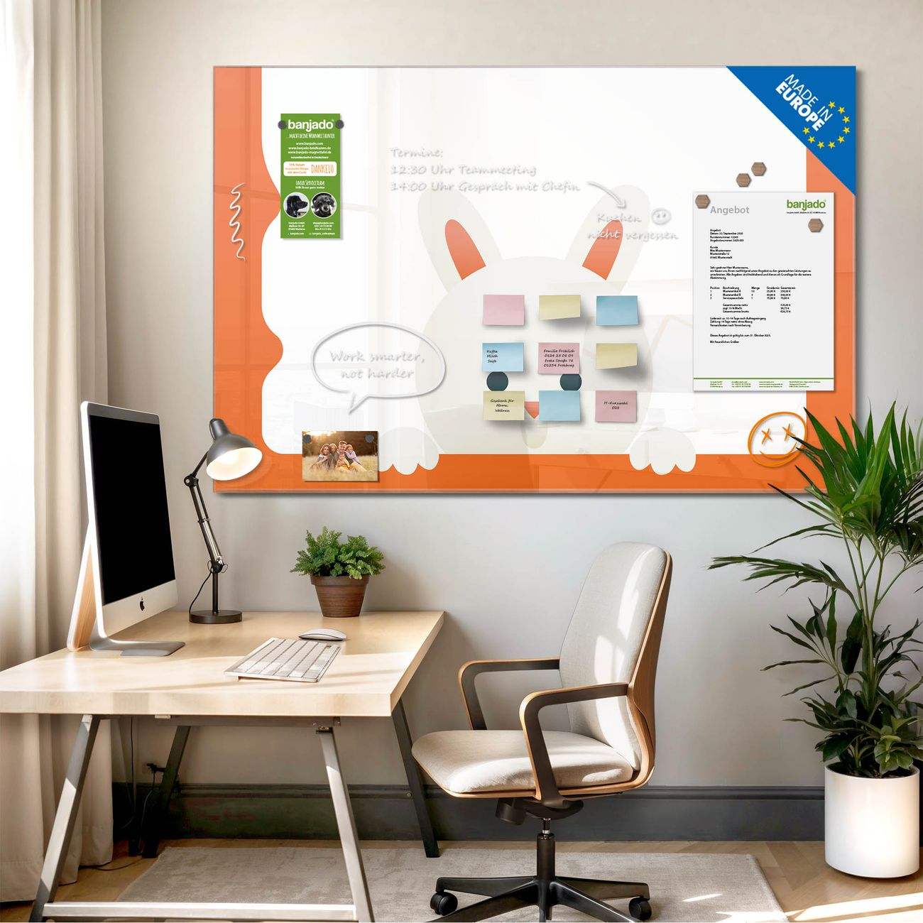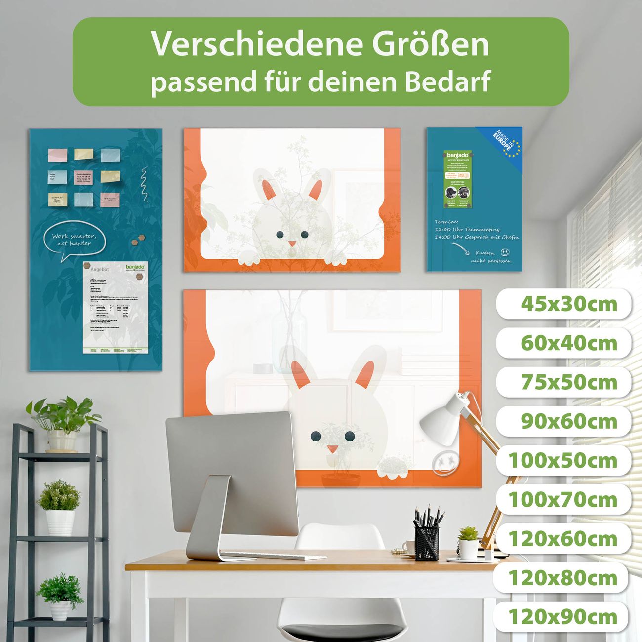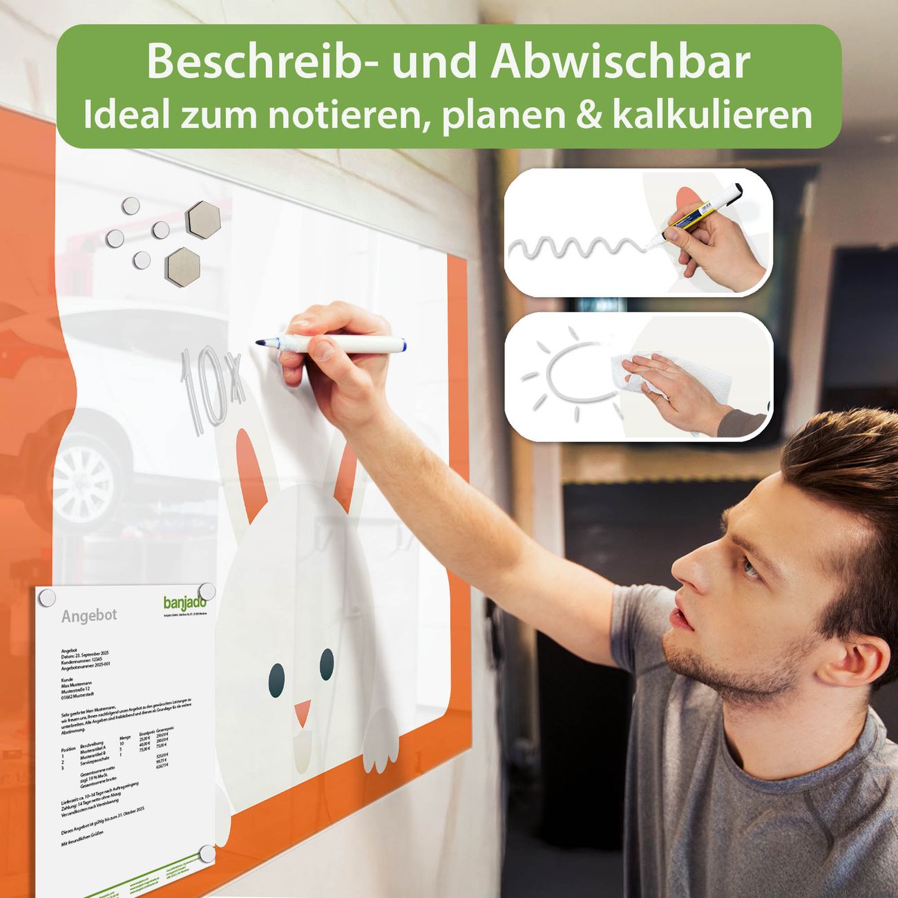 Jede Glas Magnettafel wird in unserer Werkstatt von Hand gefertigt und sorgfältig geprüft. So erhalten Sie ein echtes Qualitätsprodukt, das Funktion und Ästhetik perfekt vereint.?? Warum banjado?