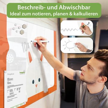 Auf der glatten Glasoberfläche lassen sich Termine, Rezepte oder Notizen ganz einfach mit Kreidestiften festhalten und rückstandslos entfernen. Starke Neodym-Magnete halten Ihre wichtigsten Erinnerungen sicher an Ort und Stelle. So entsteht Ihre ganz persönliche Ideenwand - jeden Tag neu.