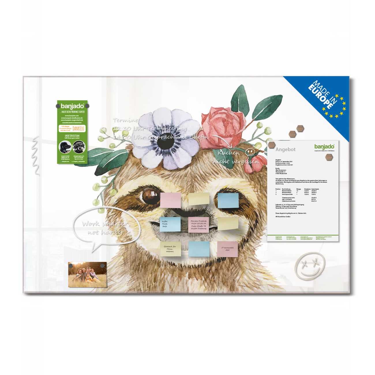 Ein Stück Design, das Ihren Alltag organisiert. Schreiben, heften, inspirieren - alles an einem Ort. Qualität, die man spürt. Montage leicht gemacht. Handwerk mit Herz - veredelt in Sachsen. Einzigartiges Design mit Motiv Motiv Fröhliches Faultier mit Blumenkranz Beschreibbare Glasoberfläche, leicht zu reinigen Starke Magnetkraft durch Stahlrückwand Inklusive 4 Neodym-Magneten Flexible Montageoptionen Handveredelt in Sachsen - Qualität, die bleibt
