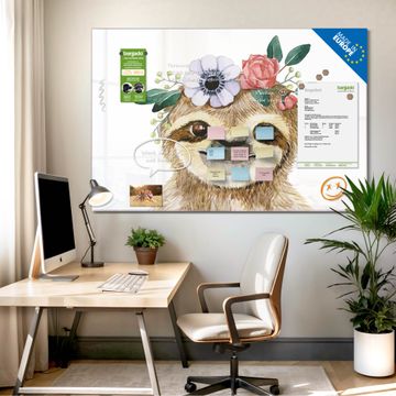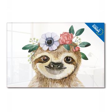Glas Magnettafel im Querformat Motiv Fröhliches Faultier mit Blumenkranz