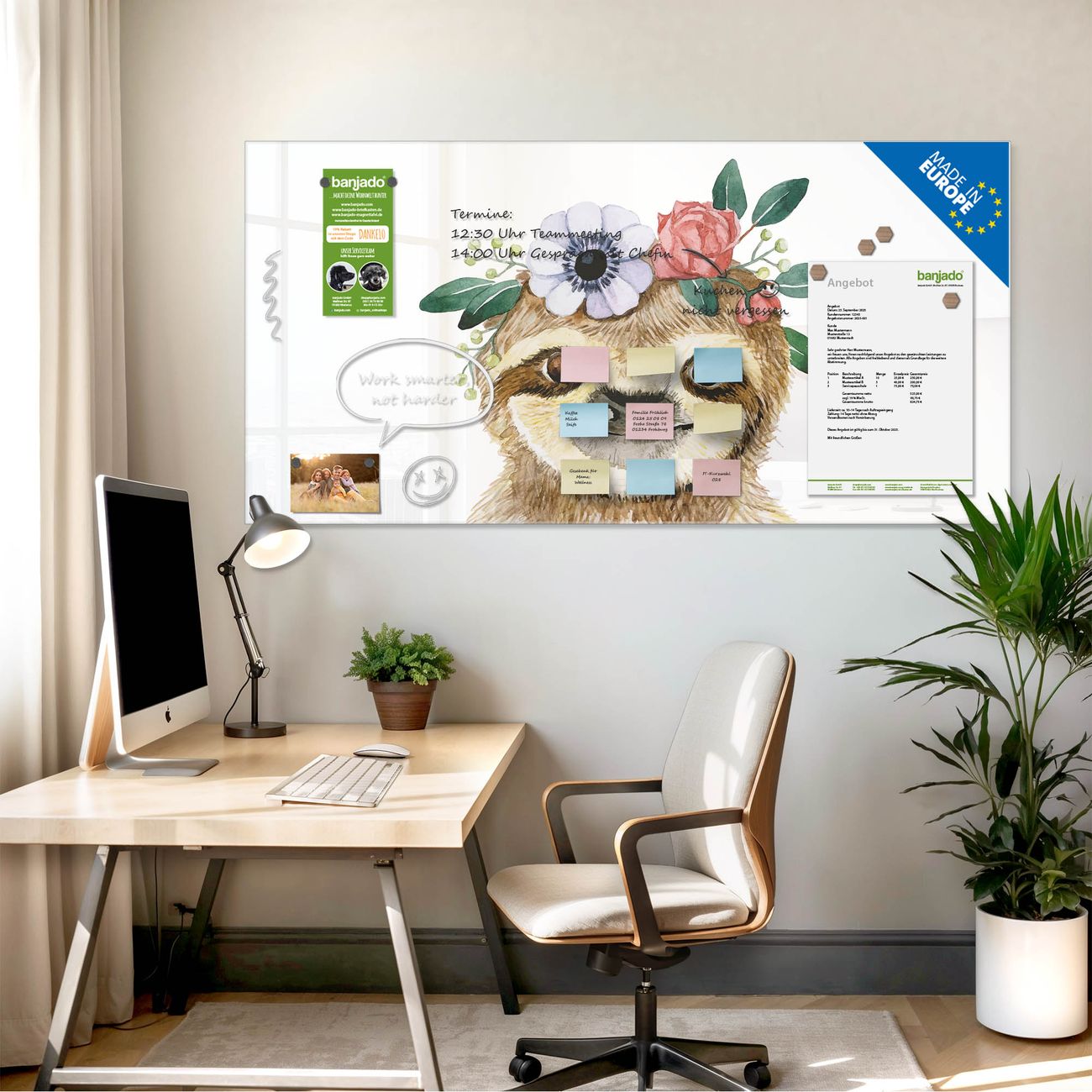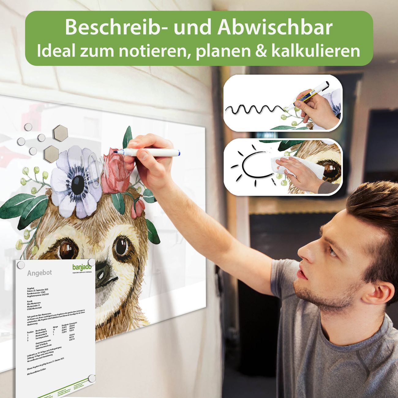 Jede Glas Magnettafel wird in unserer Werkstatt von Hand gefertigt und sorgfältig geprüft. So erhalten Sie ein echtes Qualitätsprodukt, das Funktion und Ästhetik perfekt vereint.?? Warum banjado?