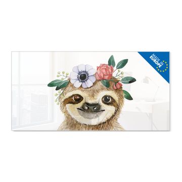 Glas Magnettafel im Querformat Motiv Fröhliches Faultier mit Blumenkranz