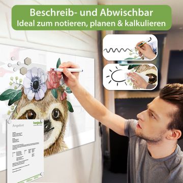 Die banjado Glas Magnettafel mit dem Motiv Motiv Fröhliches Faultier mit Blumenkranz verbindet Funktionalität mit Stil. Sie ersetzt das Zettelchaos durch klare Strukturen und bringt dabei eine warme, natürliche Atmosphäre in Ihr Zuhause. Ob im Büro, in der Küche oder im Eingangsbereich - dieses Design-Board zieht Blicke an und sorgt für Ordnung mit Charakter.