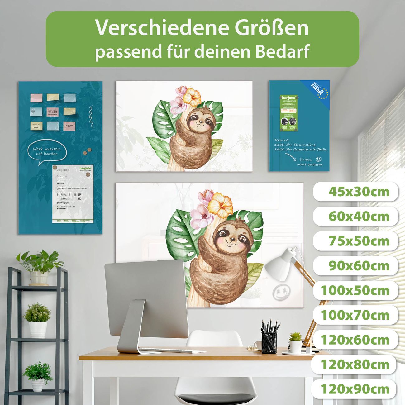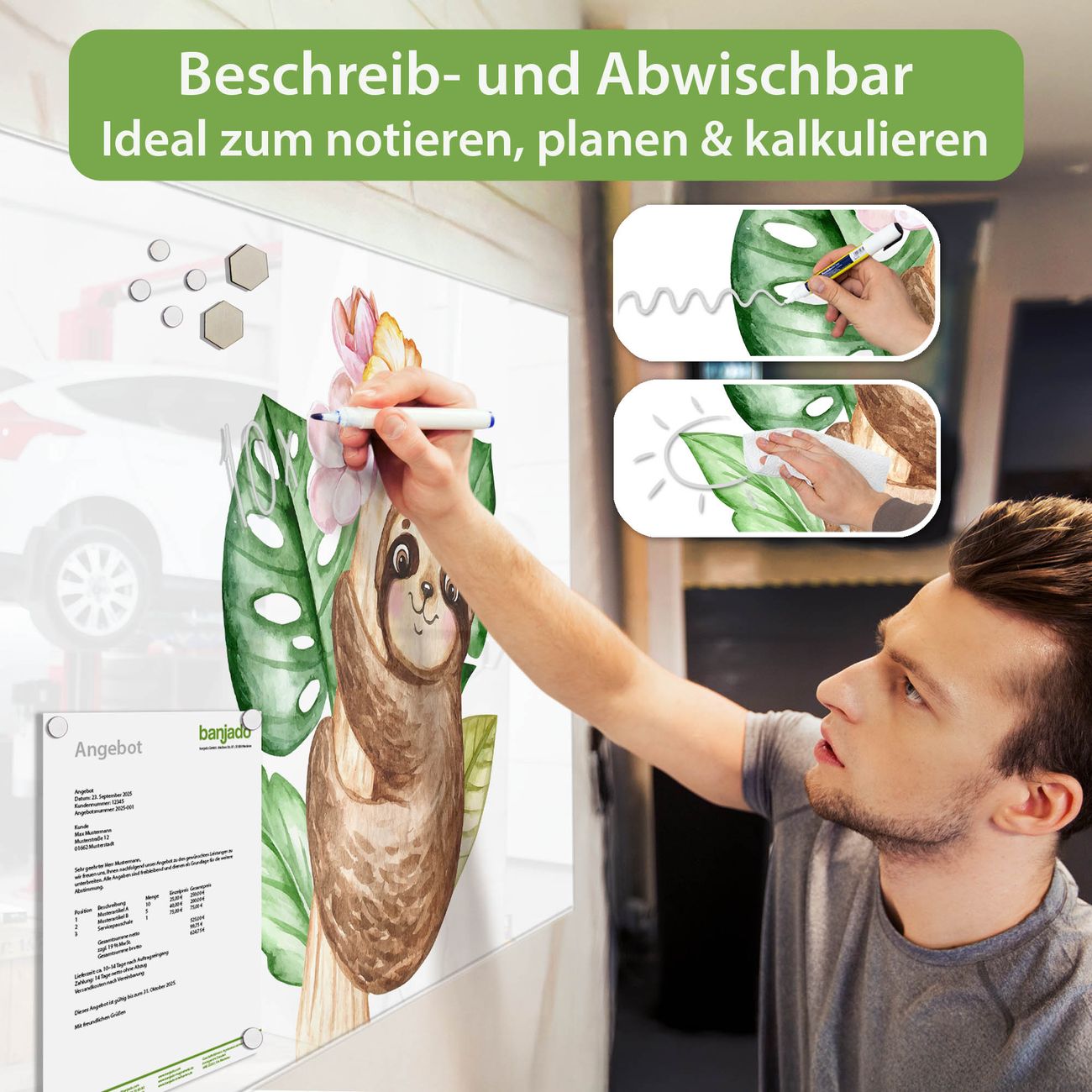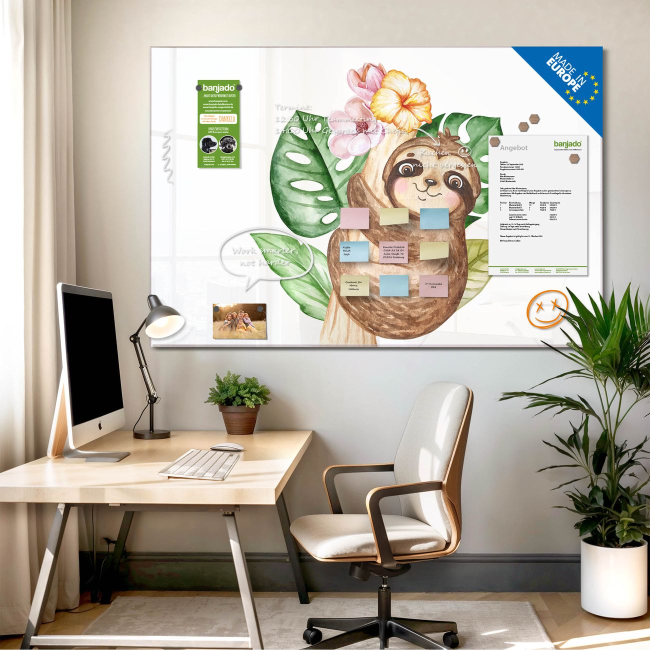 Die banjado Glas Magnettafel mit dem Motiv Motiv Fröhliches Faultier verbindet Funktionalität mit Stil. Sie ersetzt das Zettelchaos durch klare Strukturen und bringt dabei eine warme, natürliche Atmosphäre in Ihr Zuhause. Ob im Büro, in der Küche oder im Eingangsbereich - dieses Design-Board zieht Blicke an und sorgt für Ordnung mit Charakter.