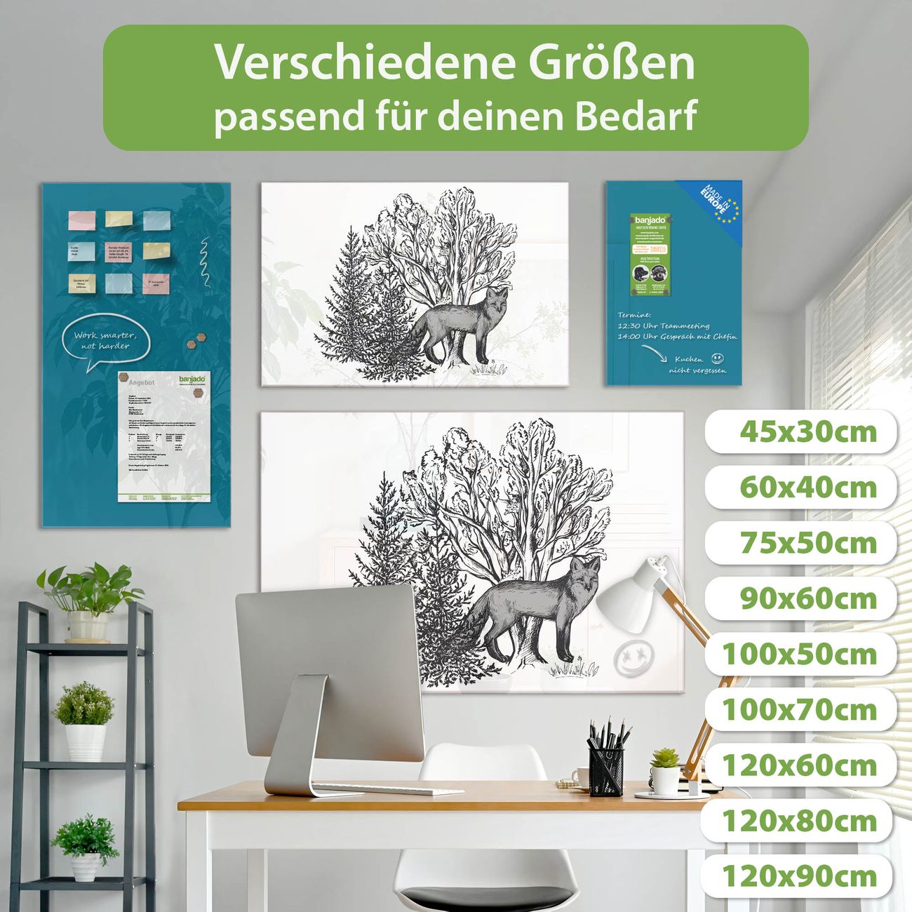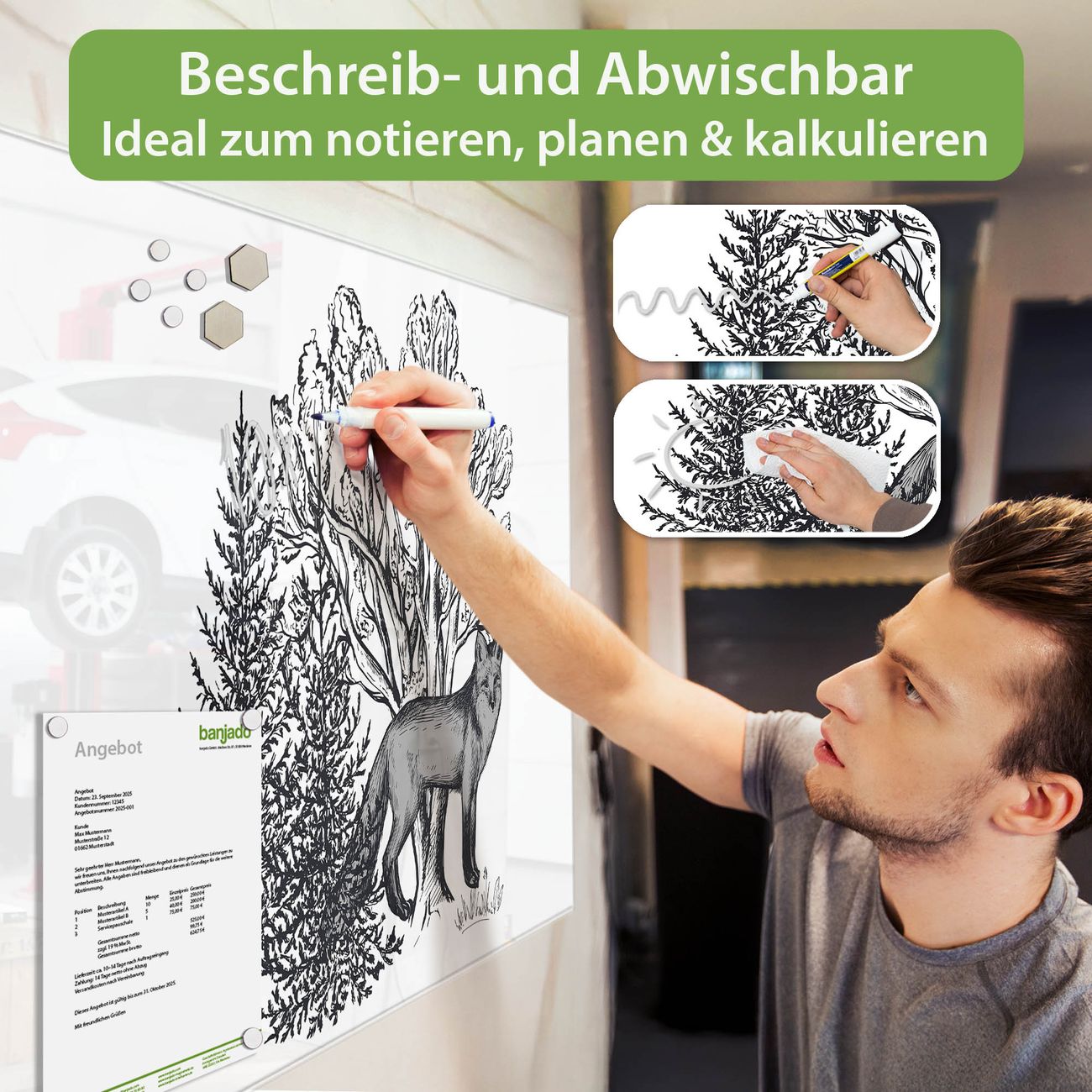 Jede Glas Magnettafel wird in unserer Werkstatt von Hand gefertigt und sorgfältig geprüft. So erhalten Sie ein echtes Qualitätsprodukt, das Funktion und Ästhetik perfekt vereint.?? Warum banjado?