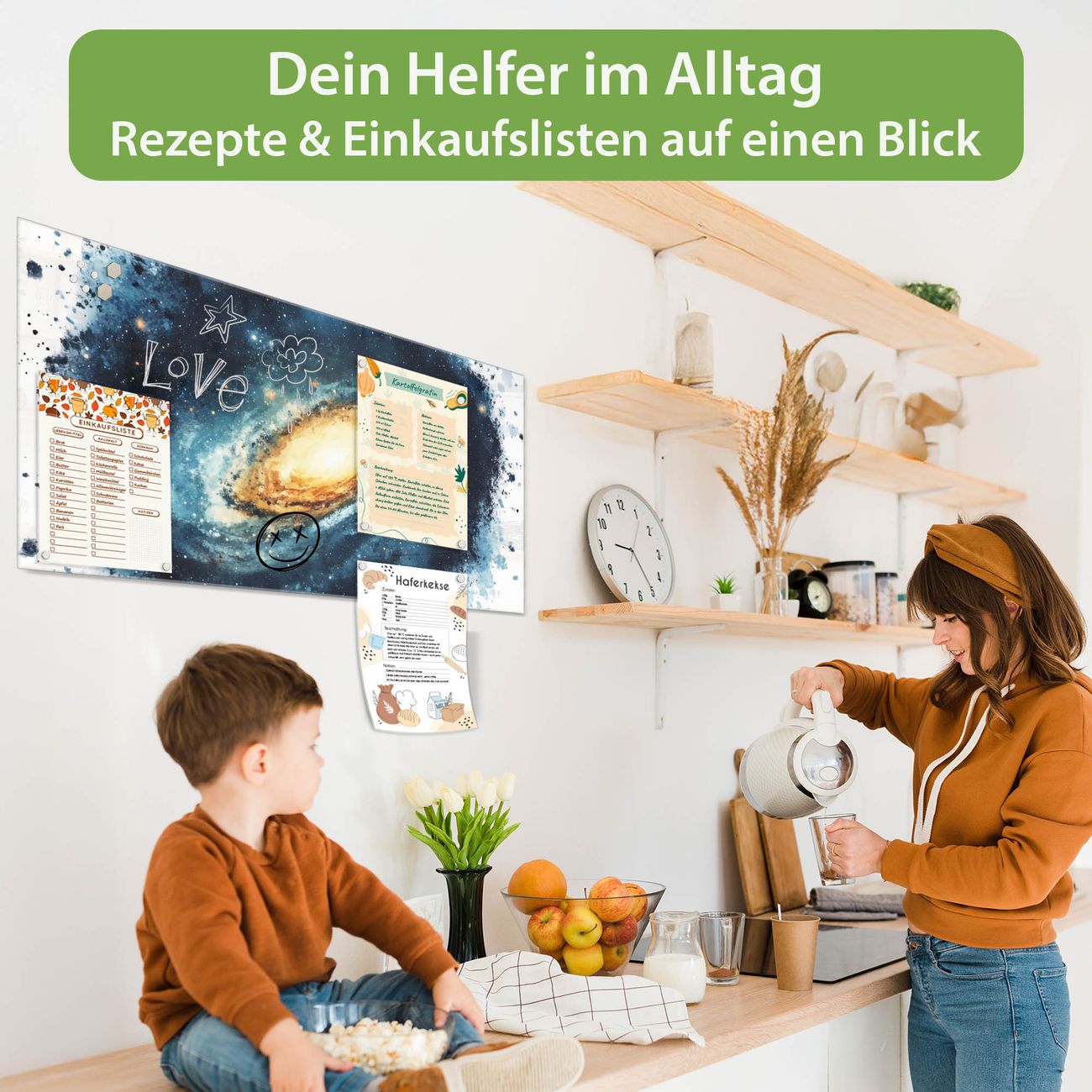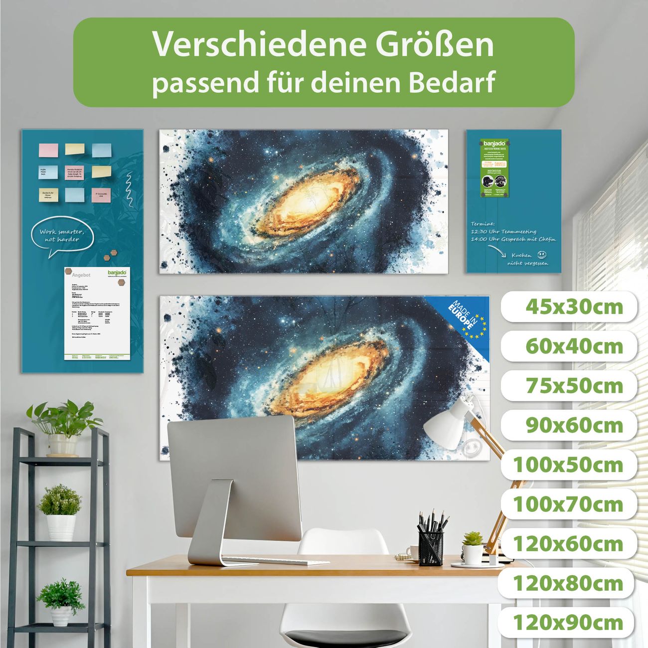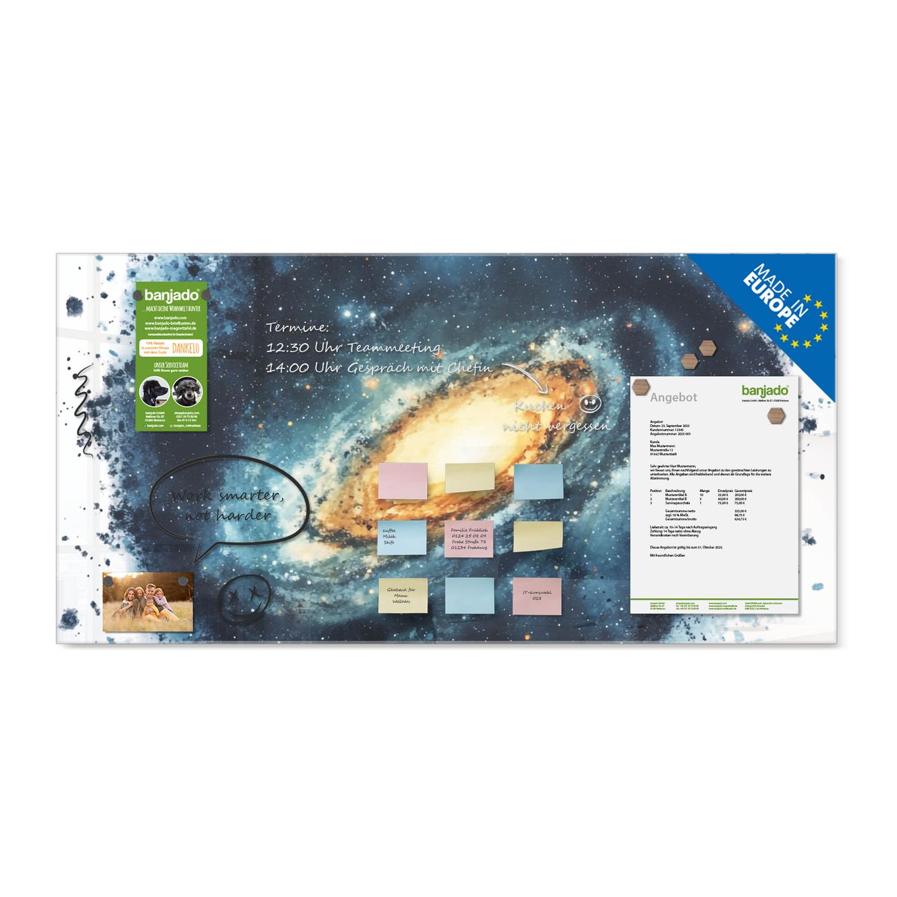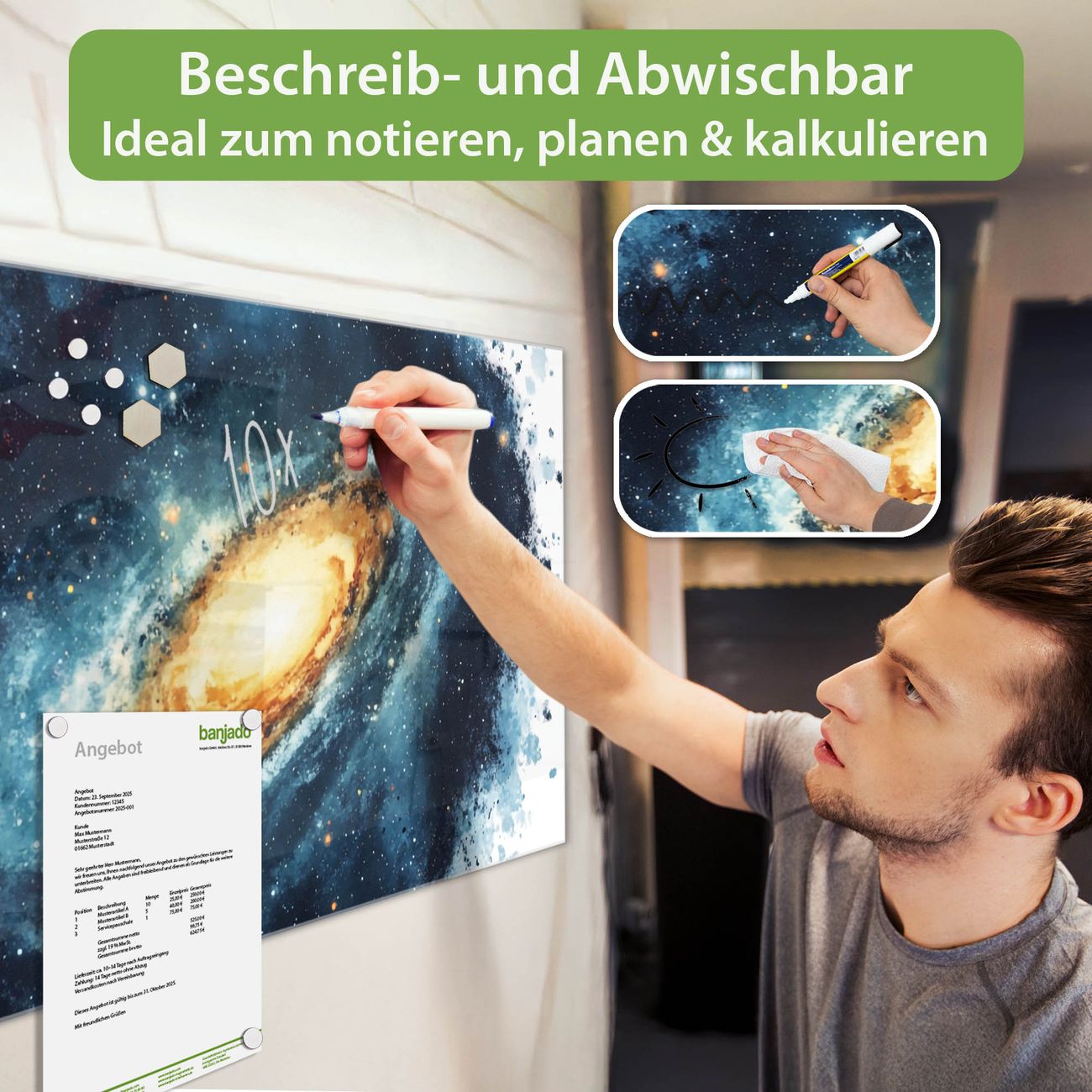 Ein Stück Design, das Ihren Alltag organisiert. Schreiben, heften, inspirieren - alles an einem Ort. Qualität, die man spürt. Montage leicht gemacht. Handwerk mit Herz - veredelt in Sachsen. Einzigartiges Design mit Motiv Motiv Galaktische Explosion Beschreibbare Glasoberfläche, leicht zu reinigen Starke Magnetkraft durch Stahlrückwand Inklusive 4 Neodym-Magneten Flexible Montageoptionen Handveredelt in Sachsen - Qualität, die bleibt