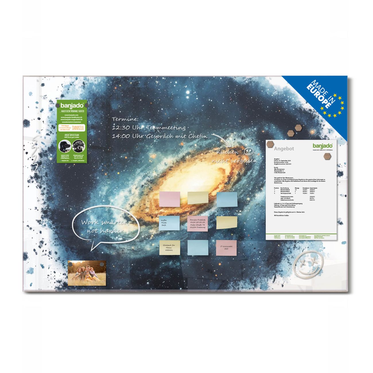 Ein Stück Design, das Ihren Alltag organisiert. Schreiben, heften, inspirieren - alles an einem Ort. Qualität, die man spürt. Montage leicht gemacht. Handwerk mit Herz - veredelt in Sachsen. Einzigartiges Design mit Motiv Motiv Galaktische Explosion Beschreibbare Glasoberfläche, leicht zu reinigen Starke Magnetkraft durch Stahlrückwand Inklusive 4 Neodym-Magneten Flexible Montageoptionen Handveredelt in Sachsen - Qualität, die bleibt