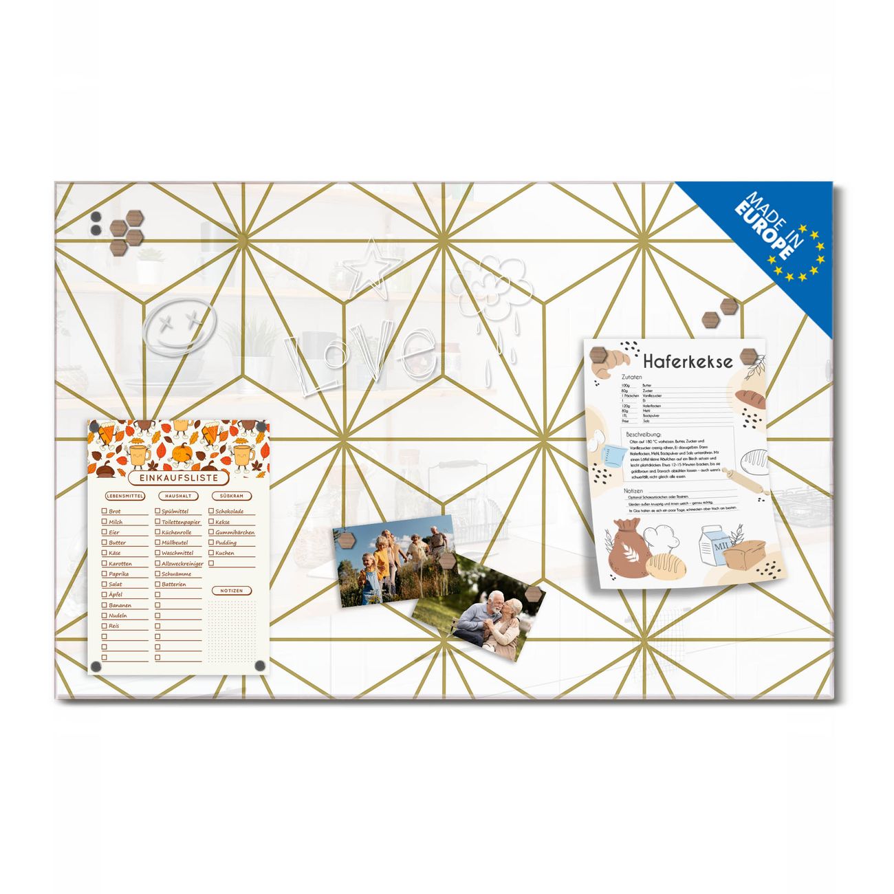 Ein Stück Design, das Ihren Alltag organisiert. Schreiben, heften, inspirieren - alles an einem Ort. Qualität, die man spürt. Montage leicht gemacht. Handwerk mit Herz - veredelt in Sachsen. Einzigartiges Design mit Motiv Motiv Geometrische Eleganz Beschreibbare Glasoberfläche, leicht zu reinigen Starke Magnetkraft durch Stahlrückwand Inklusive 4 Neodym-Magneten Flexible Montageoptionen Handveredelt in Sachsen - Qualität, die bleibt