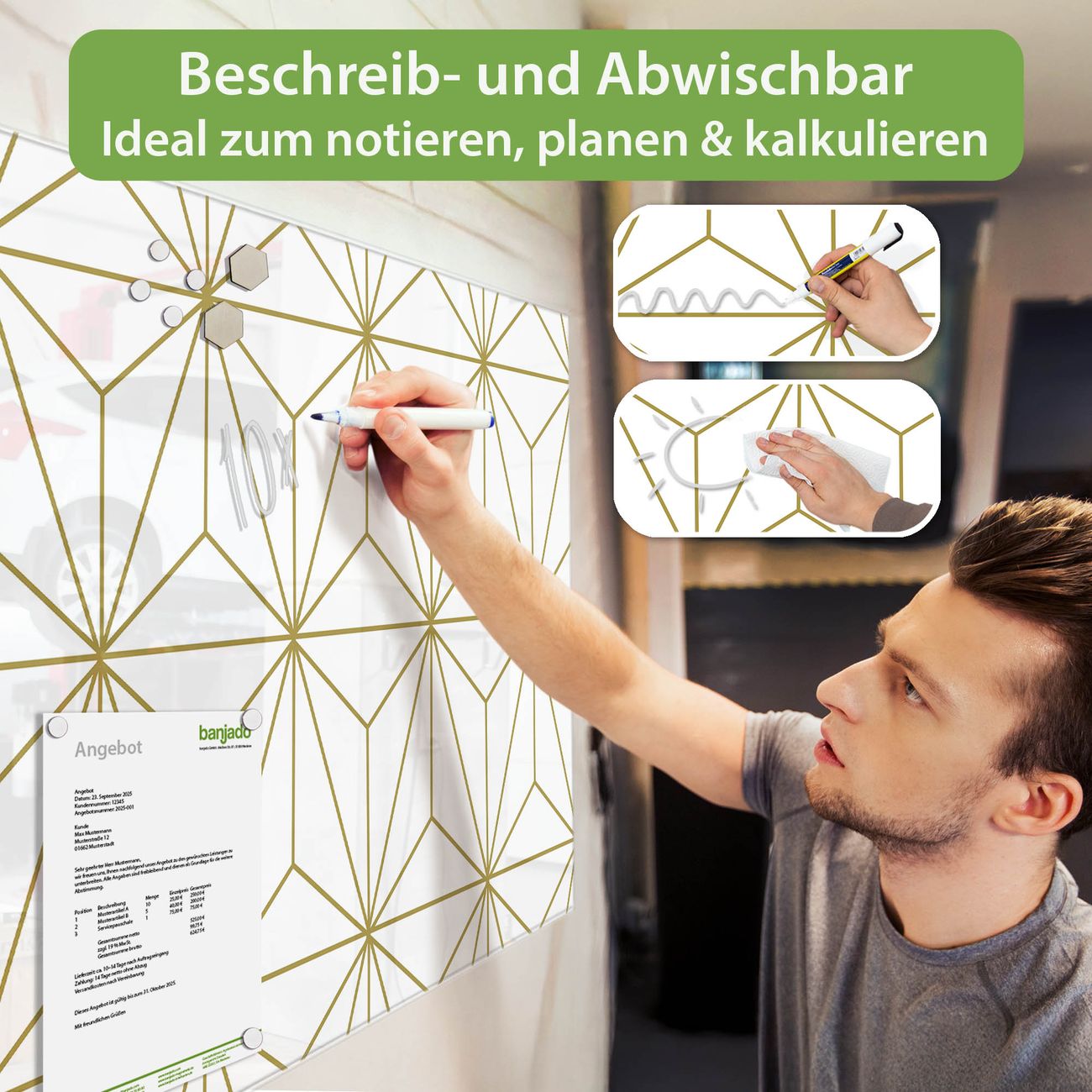 Jede Glas Magnettafel wird in unserer Werkstatt von Hand gefertigt und sorgfältig geprüft. So erhalten Sie ein echtes Qualitätsprodukt, das Funktion und Ästhetik perfekt vereint.?? Warum banjado?