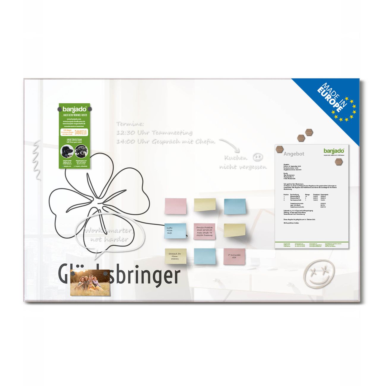 Jede Glas Magnettafel wird in unserer Werkstatt von Hand gefertigt und sorgfältig geprüft. So erhalten Sie ein echtes Qualitätsprodukt, das Funktion und Ästhetik perfekt vereint.?? Warum banjado?