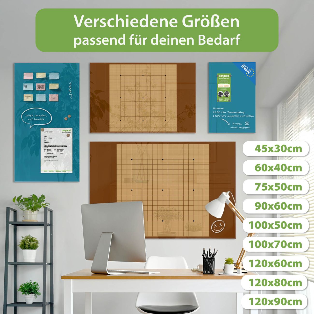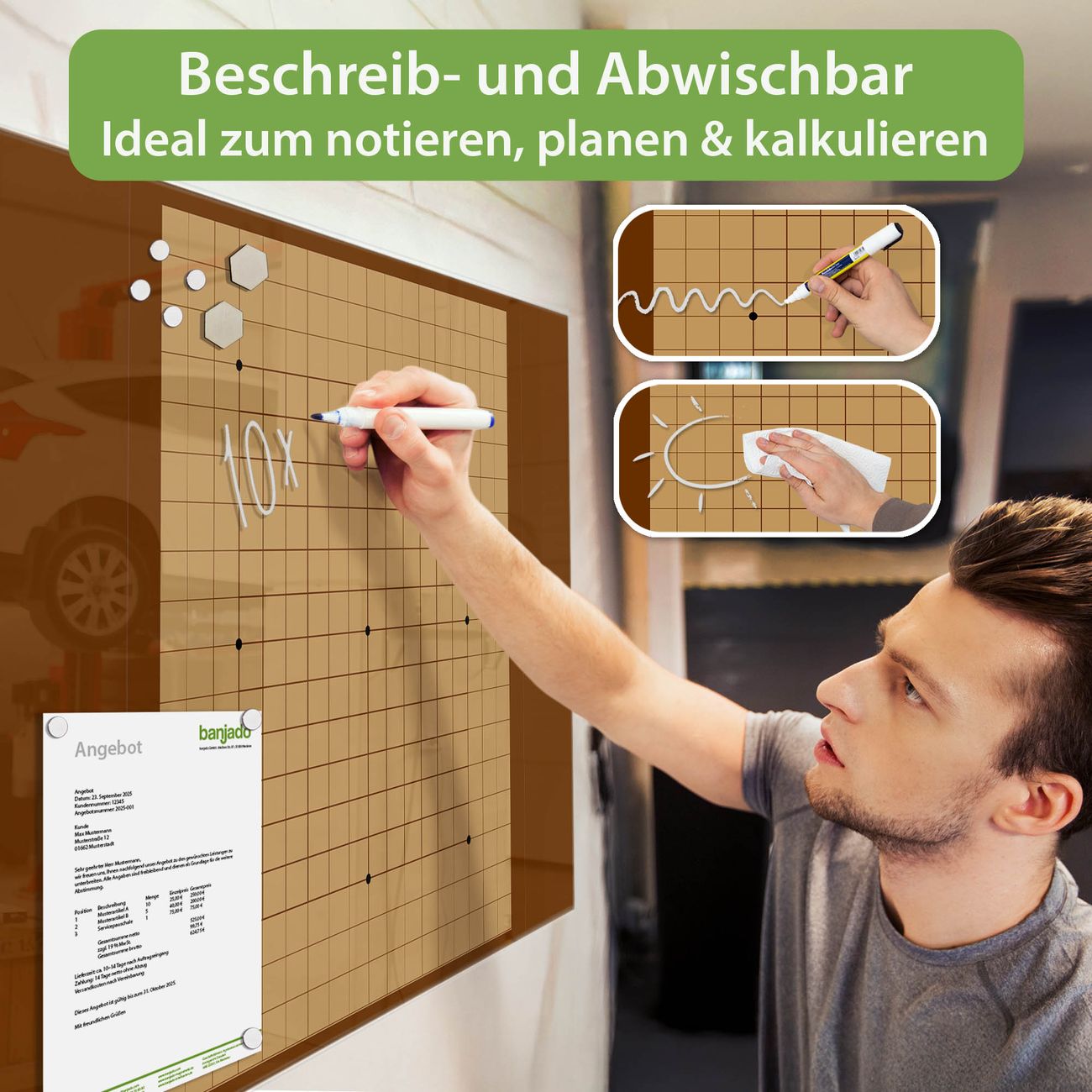 Jede Glas Magnettafel wird in unserer Werkstatt von Hand gefertigt und sorgfältig geprüft. So erhalten Sie ein echtes Qualitätsprodukt, das Funktion und Ästhetik perfekt vereint.?? Warum banjado?