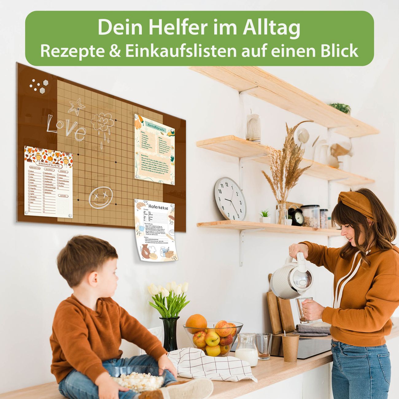 Auf der glatten Glasoberfläche lassen sich Termine, Rezepte oder Notizen ganz einfach mit Kreidestiften festhalten und rückstandslos entfernen. Starke Neodym-Magnete halten Ihre wichtigsten Erinnerungen sicher an Ort und Stelle. So entsteht Ihre ganz persönliche Ideenwand - jeden Tag neu.