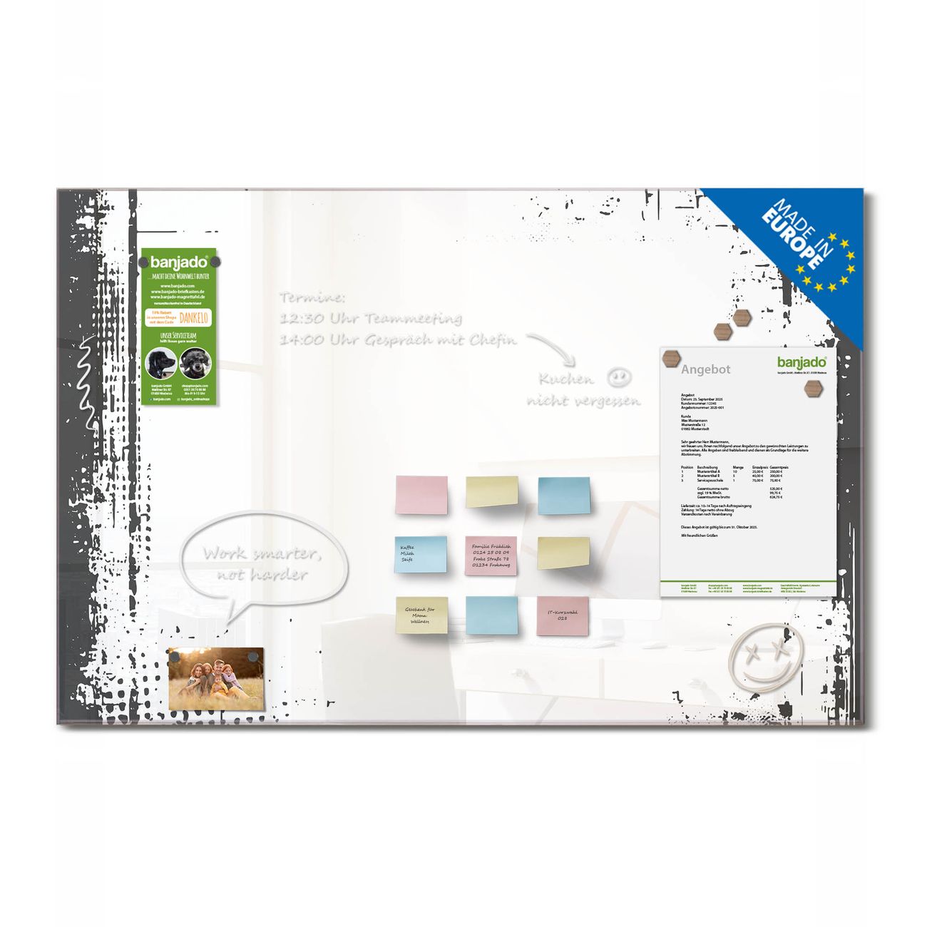 Jede Glas Magnettafel wird in unserer Werkstatt von Hand gefertigt und sorgfältig geprüft. So erhalten Sie ein echtes Qualitätsprodukt, das Funktion und Ästhetik perfekt vereint.?? Warum banjado?