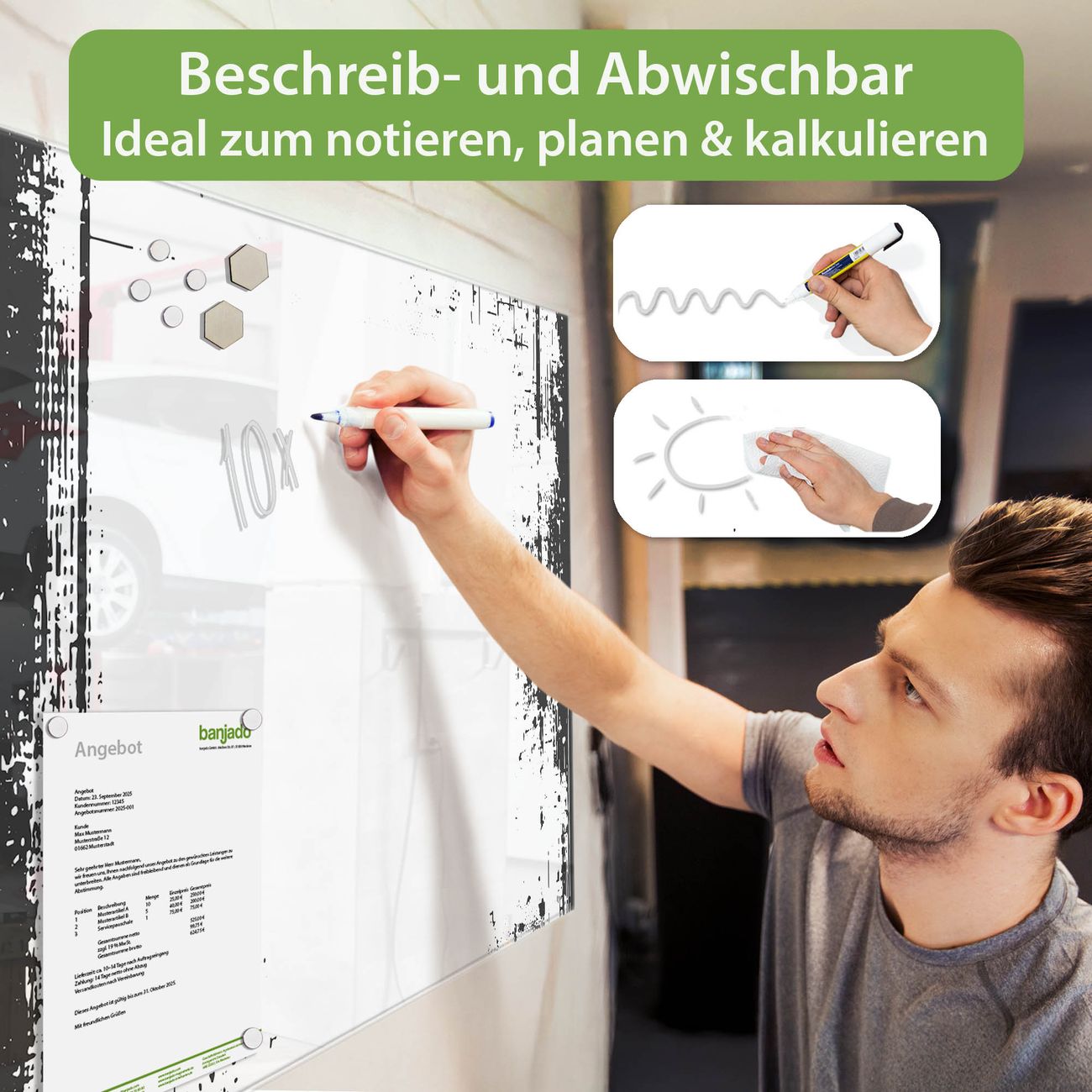 Jede Glas Magnettafel wird in unserer Werkstatt von Hand gefertigt und sorgfältig geprüft. So erhalten Sie ein echtes Qualitätsprodukt, das Funktion und Ästhetik perfekt vereint.?? Warum banjado?