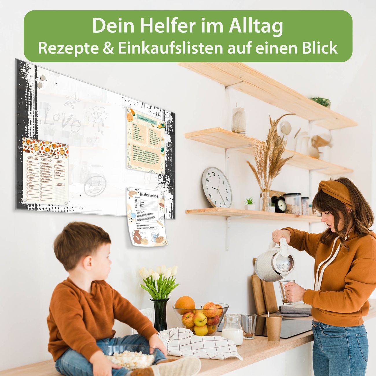 Auf der glatten Glasoberfläche lassen sich Termine, Rezepte oder Notizen ganz einfach mit Kreidestiften festhalten und rückstandslos entfernen. Starke Neodym-Magnete halten Ihre wichtigsten Erinnerungen sicher an Ort und Stelle. So entsteht Ihre ganz persönliche Ideenwand - jeden Tag neu.