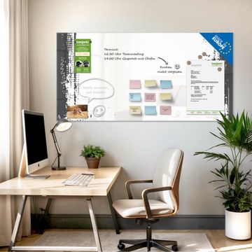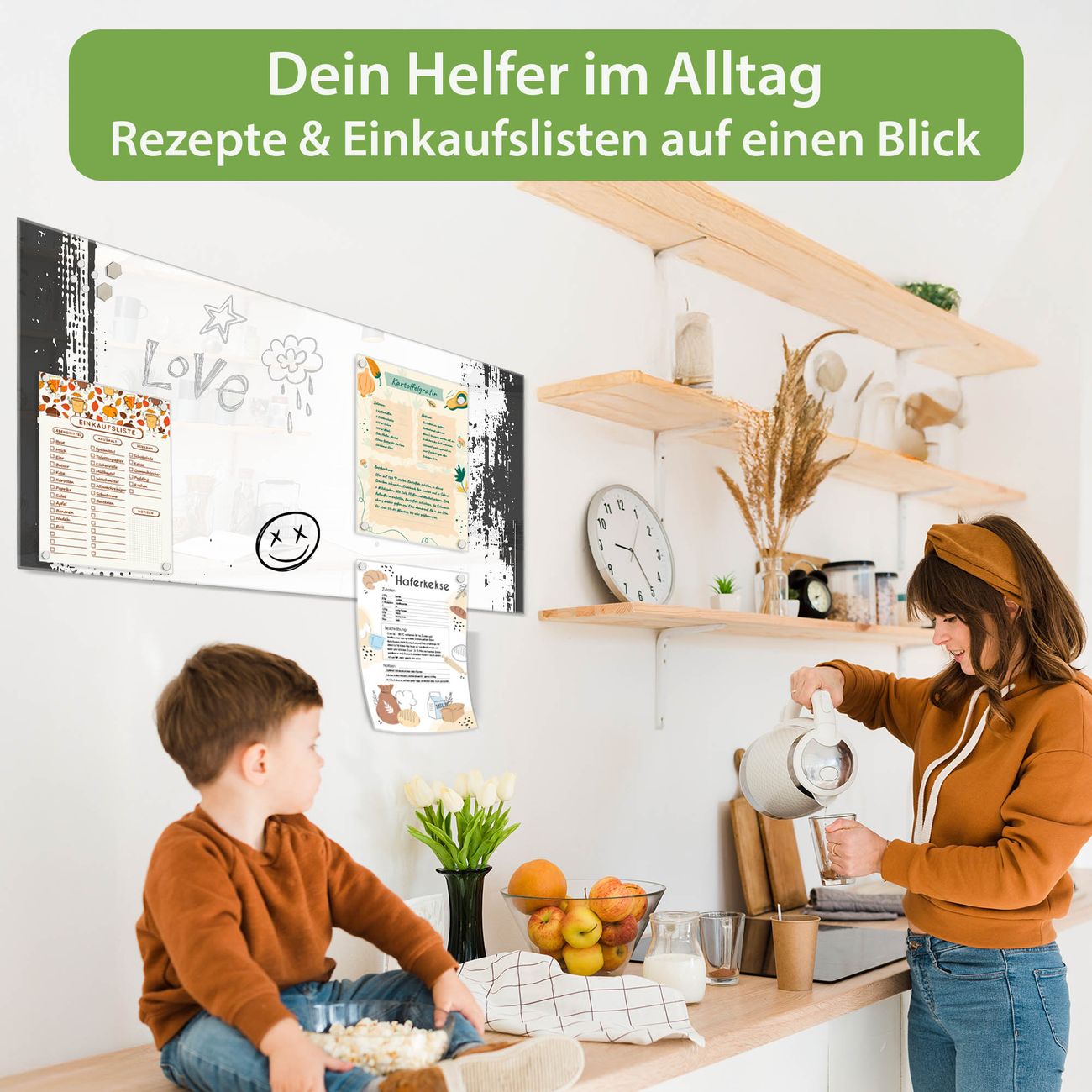 Auf der glatten Glasoberfläche lassen sich Termine, Rezepte oder Notizen ganz einfach mit Kreidestiften festhalten und rückstandslos entfernen. Starke Neodym-Magnete halten Ihre wichtigsten Erinnerungen sicher an Ort und Stelle. So entsteht Ihre ganz persönliche Ideenwand - jeden Tag neu.
