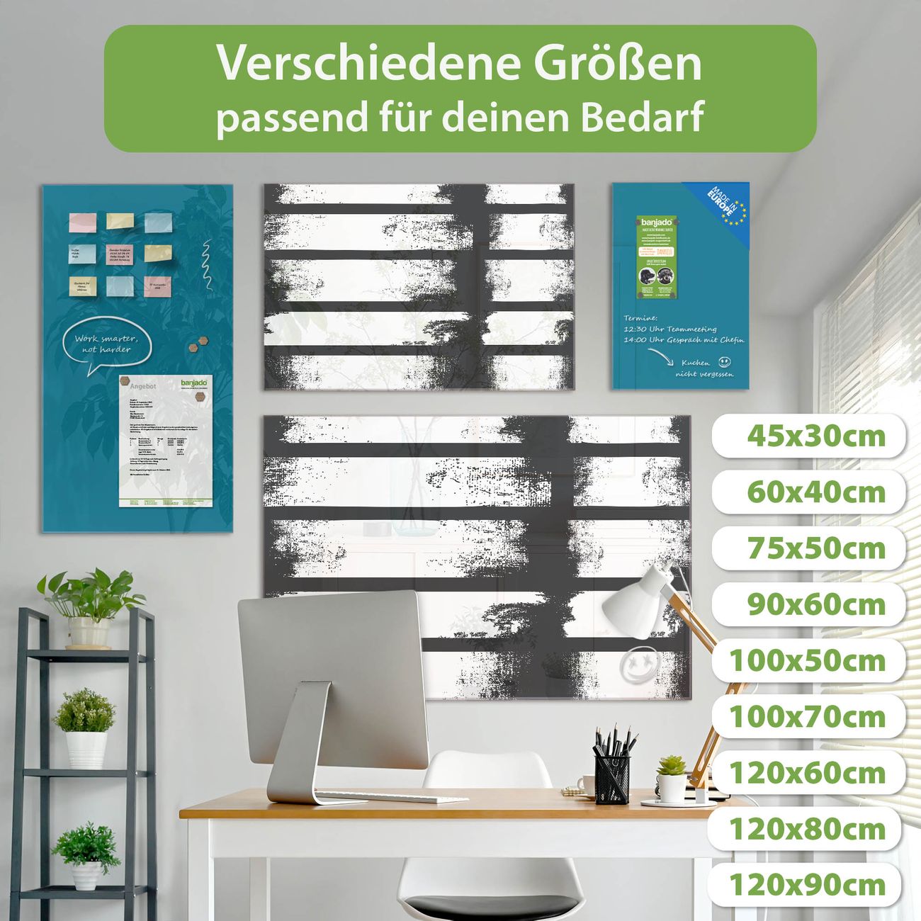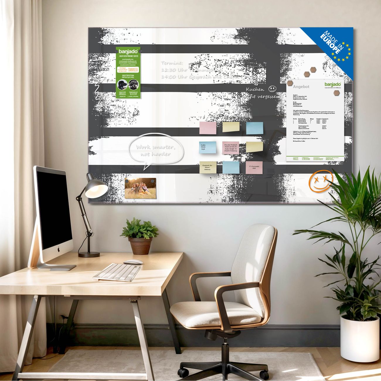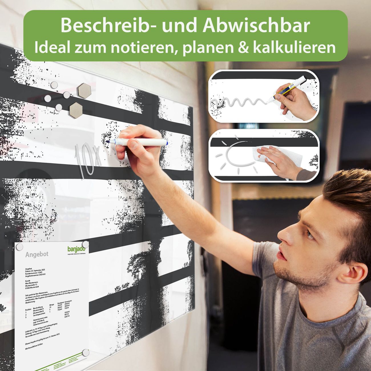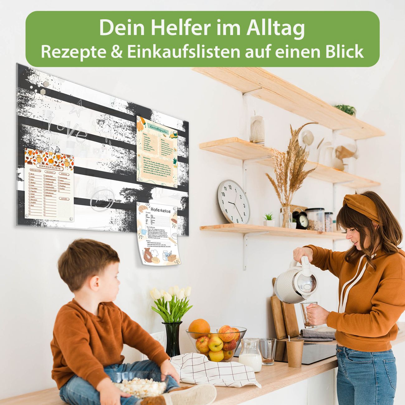 Ein Stück Design, das Ihren Alltag organisiert. Schreiben, heften, inspirieren - alles an einem Ort. Qualität, die man spürt. Montage leicht gemacht. Handwerk mit Herz - veredelt in Sachsen. Einzigartiges Design mit Motiv Motiv Grunge Streifen Beschreibbare Glasoberfläche, leicht zu reinigen Starke Magnetkraft durch Stahlrückwand Inklusive 4 Neodym-Magneten Flexible Montageoptionen Handveredelt in Sachsen - Qualität, die bleibt
