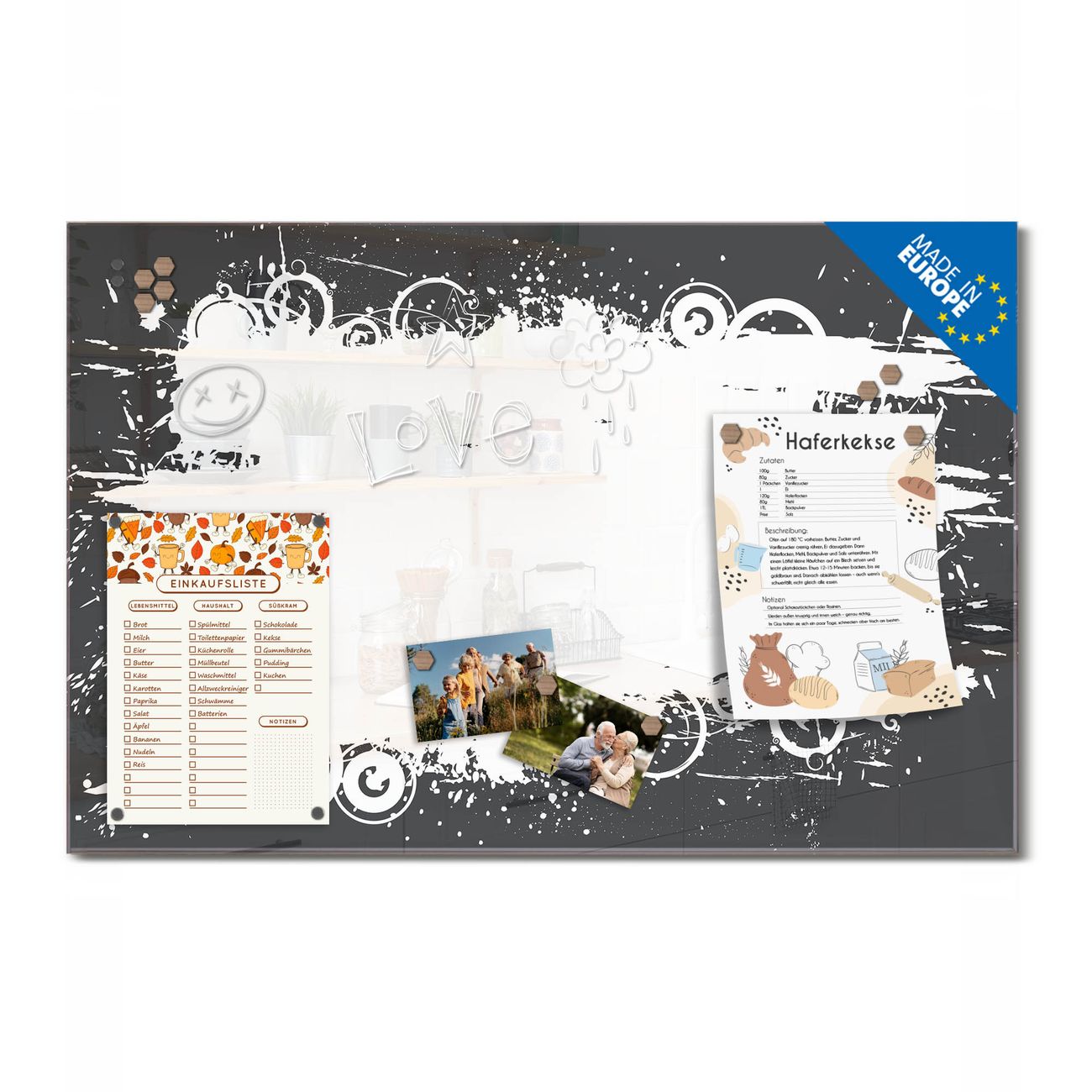 Auf der glatten Glasoberfläche lassen sich Termine, Rezepte oder Notizen ganz einfach mit Kreidestiften festhalten und rückstandslos entfernen. Starke Neodym-Magnete halten Ihre wichtigsten Erinnerungen sicher an Ort und Stelle. So entsteht Ihre ganz persönliche Ideenwand - jeden Tag neu.