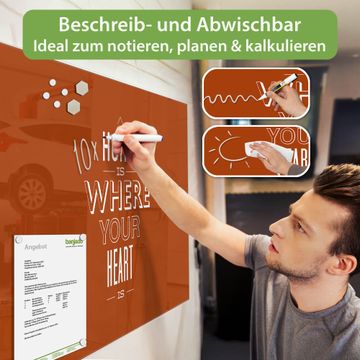 Auf der glatten Glasoberfläche lassen sich Termine, Rezepte oder Notizen ganz einfach mit Kreidestiften festhalten und rückstandslos entfernen. Starke Neodym-Magnete halten Ihre wichtigsten Erinnerungen sicher an Ort und Stelle. So entsteht Ihre ganz persönliche Ideenwand - jeden Tag neu.