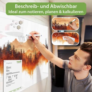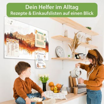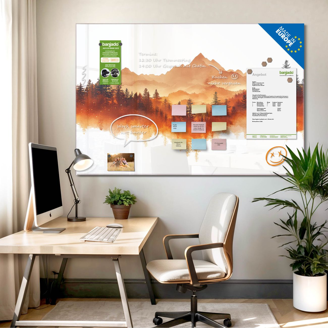 Die banjado Glas Magnettafel mit dem Motiv Motiv Herbstliche Berglandschaft verbindet Funktionalität mit Stil. Sie ersetzt das Zettelchaos durch klare Strukturen und bringt dabei eine warme, natürliche Atmosphäre in Ihr Zuhause. Ob im Büro, in der Küche oder im Eingangsbereich - dieses Design-Board zieht Blicke an und sorgt für Ordnung mit Charakter.
