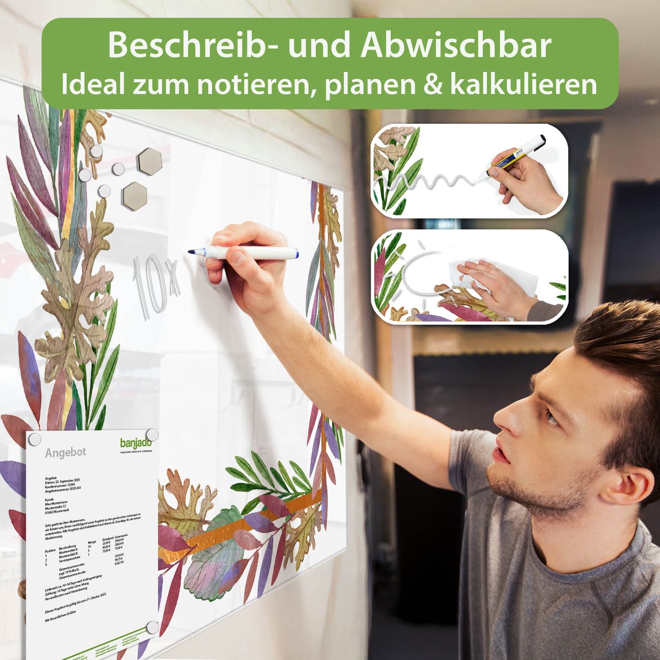Die banjado Glas Magnettafel mit dem Motiv Motiv Herbstliche Blattgirlande verbindet Funktionalität mit Stil. Sie ersetzt das Zettelchaos durch klare Strukturen und bringt dabei eine warme, natürliche Atmosphäre in Ihr Zuhause. Ob im Büro, in der Küche oder im Eingangsbereich - dieses Design-Board zieht Blicke an und sorgt für Ordnung mit Charakter.