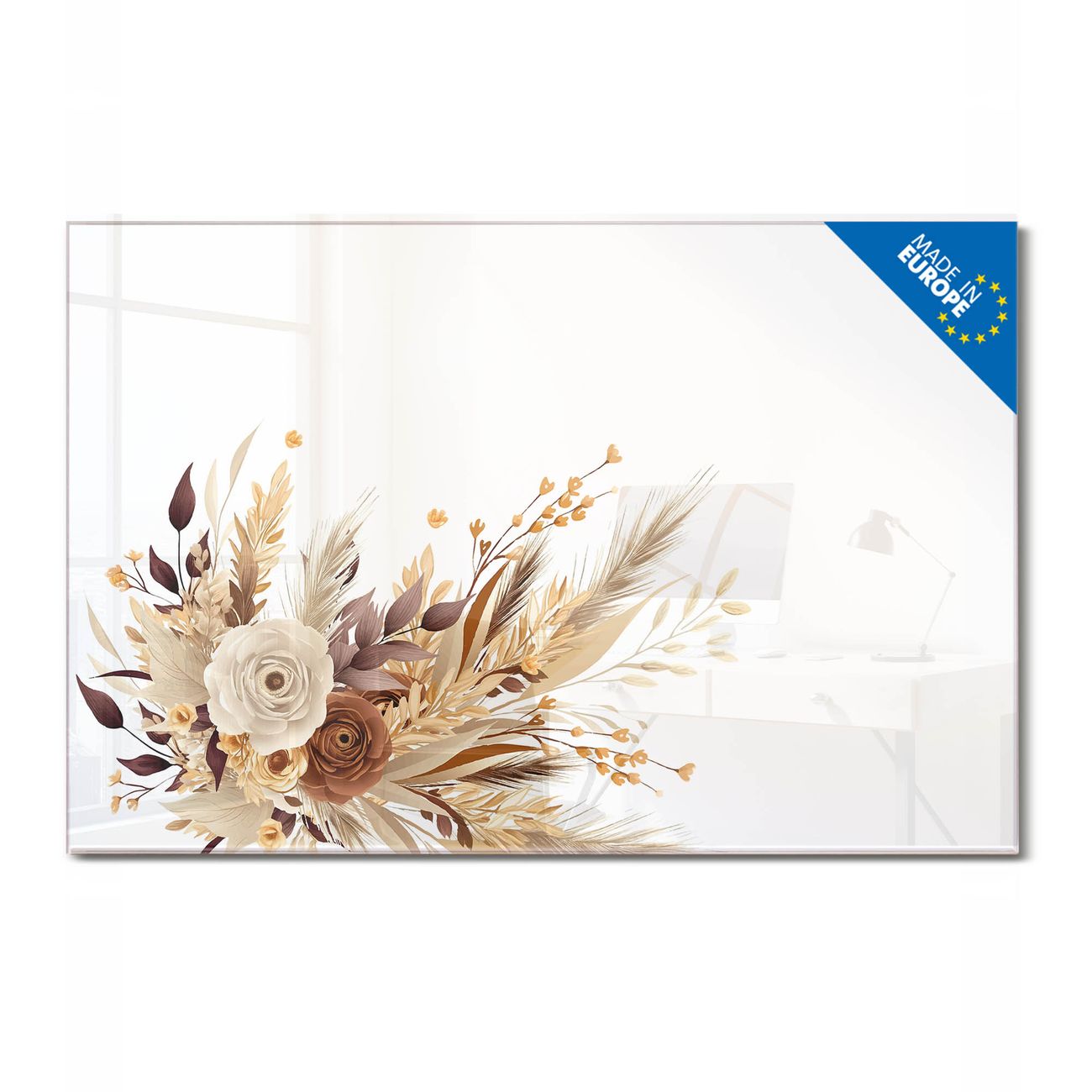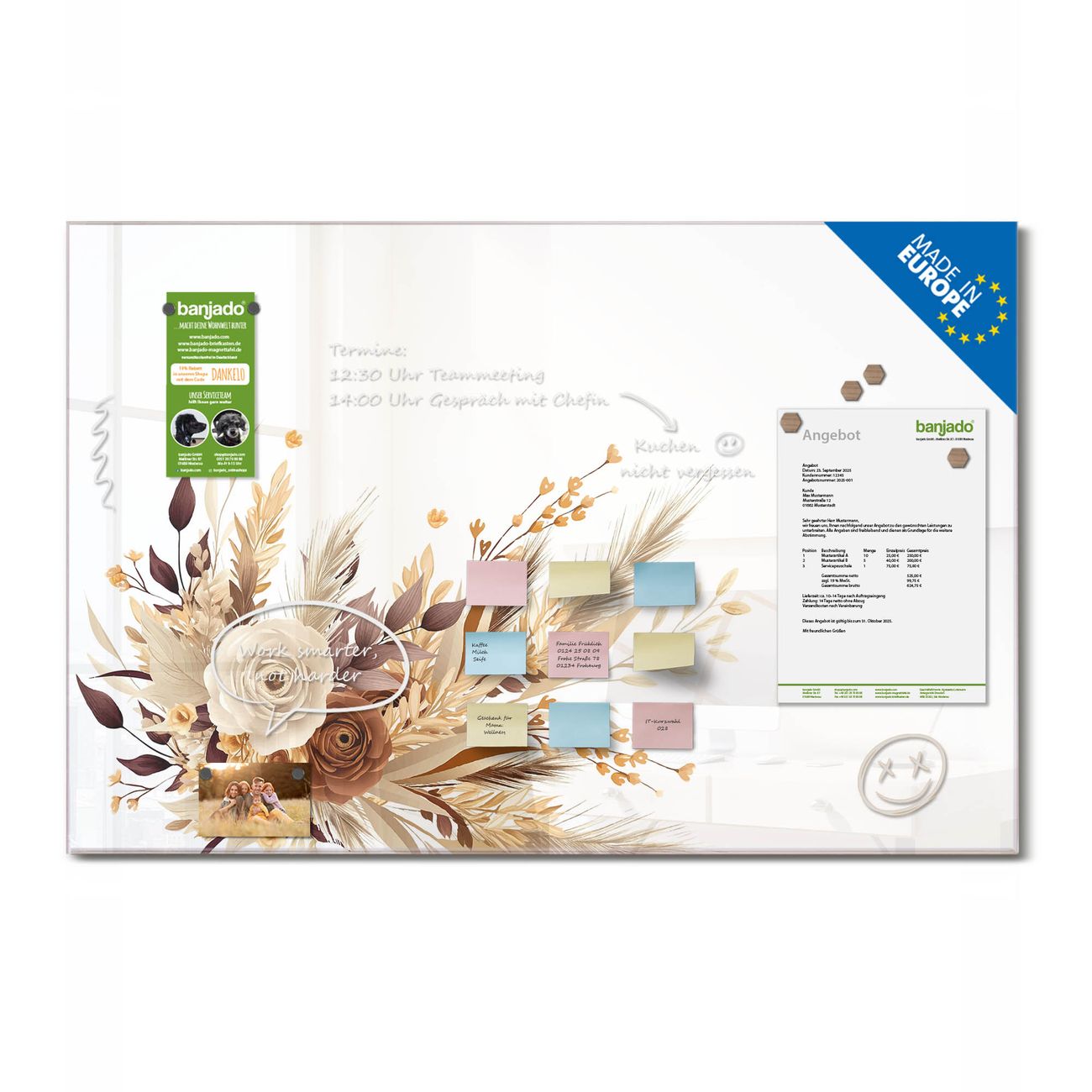 Ein Stück Design, das Ihren Alltag organisiert. Schreiben, heften, inspirieren - alles an einem Ort. Qualität, die man spürt. Montage leicht gemacht. Handwerk mit Herz - veredelt in Sachsen. Einzigartiges Design mit Motiv Motiv Herbstlicher Blumenstrauß Beschreibbare Glasoberfläche, leicht zu reinigen Starke Magnetkraft durch Stahlrückwand Inklusive 4 Neodym-Magneten Flexible Montageoptionen Handveredelt in Sachsen - Qualität, die bleibt