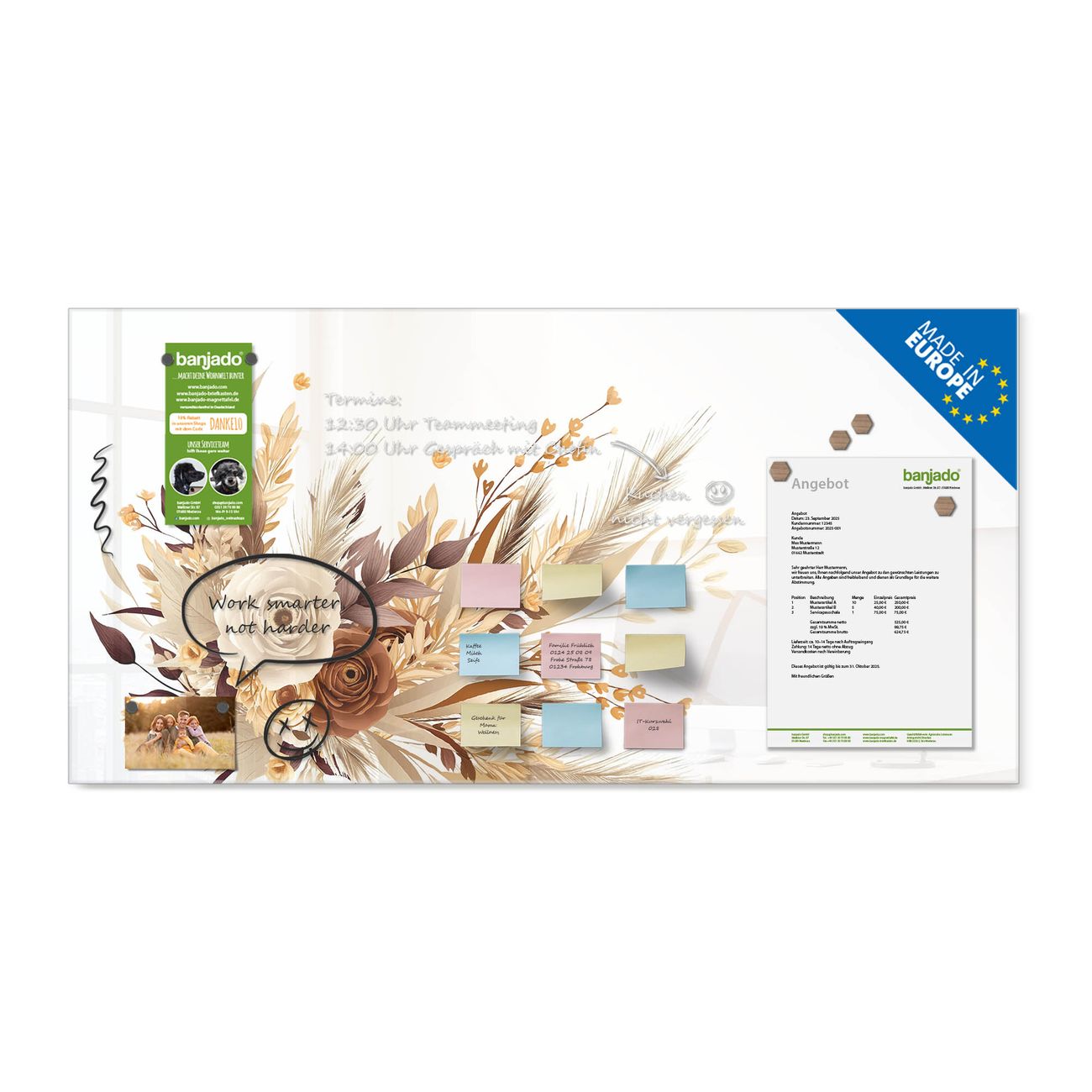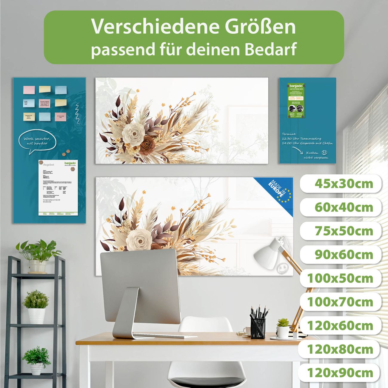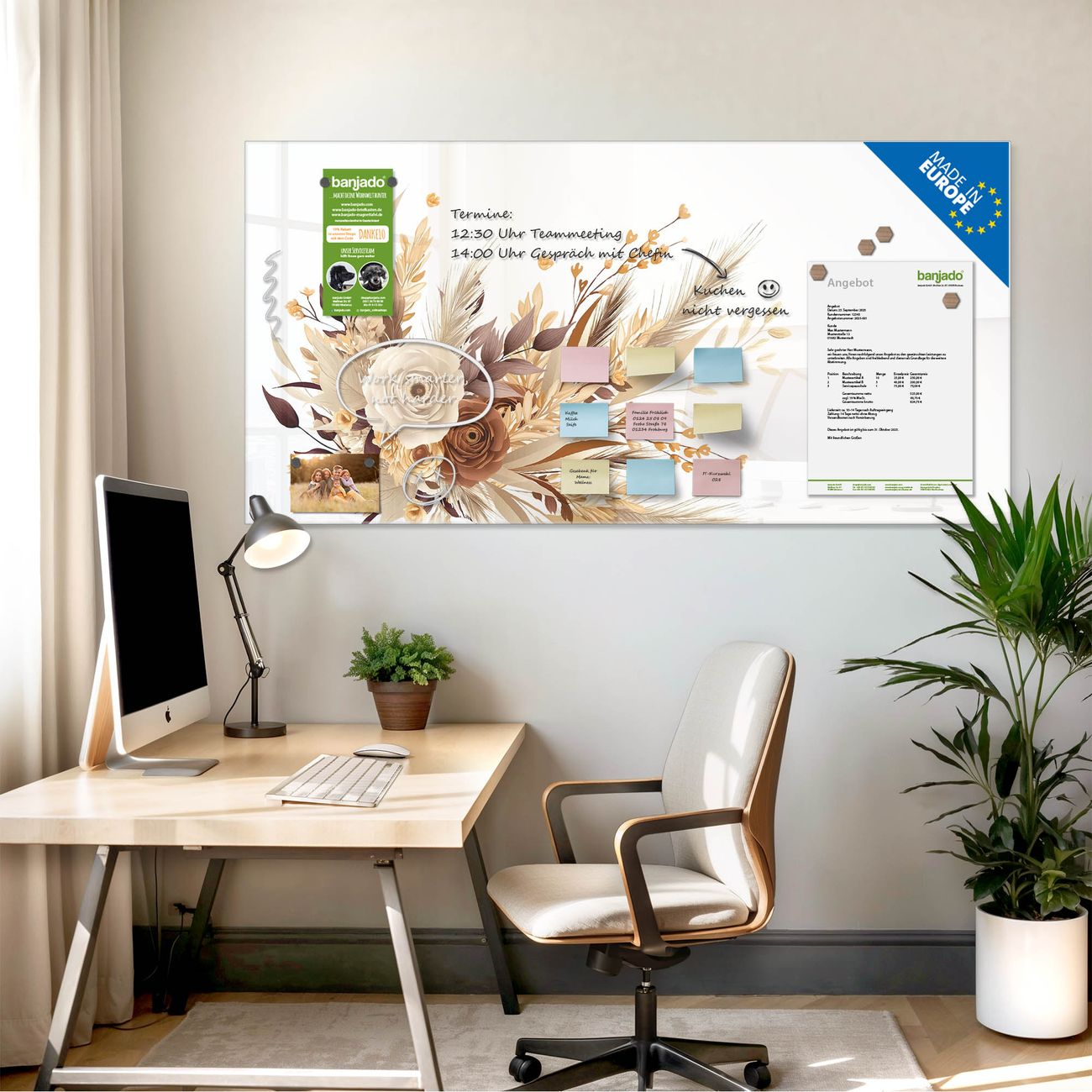 Ein Stück Design, das Ihren Alltag organisiert. Schreiben, heften, inspirieren - alles an einem Ort. Qualität, die man spürt. Montage leicht gemacht. Handwerk mit Herz - veredelt in Sachsen. Einzigartiges Design mit Motiv Motiv Herbstlicher Blumenstrauß Beschreibbare Glasoberfläche, leicht zu reinigen Starke Magnetkraft durch Stahlrückwand Inklusive 4 Neodym-Magneten Flexible Montageoptionen Handveredelt in Sachsen - Qualität, die bleibt