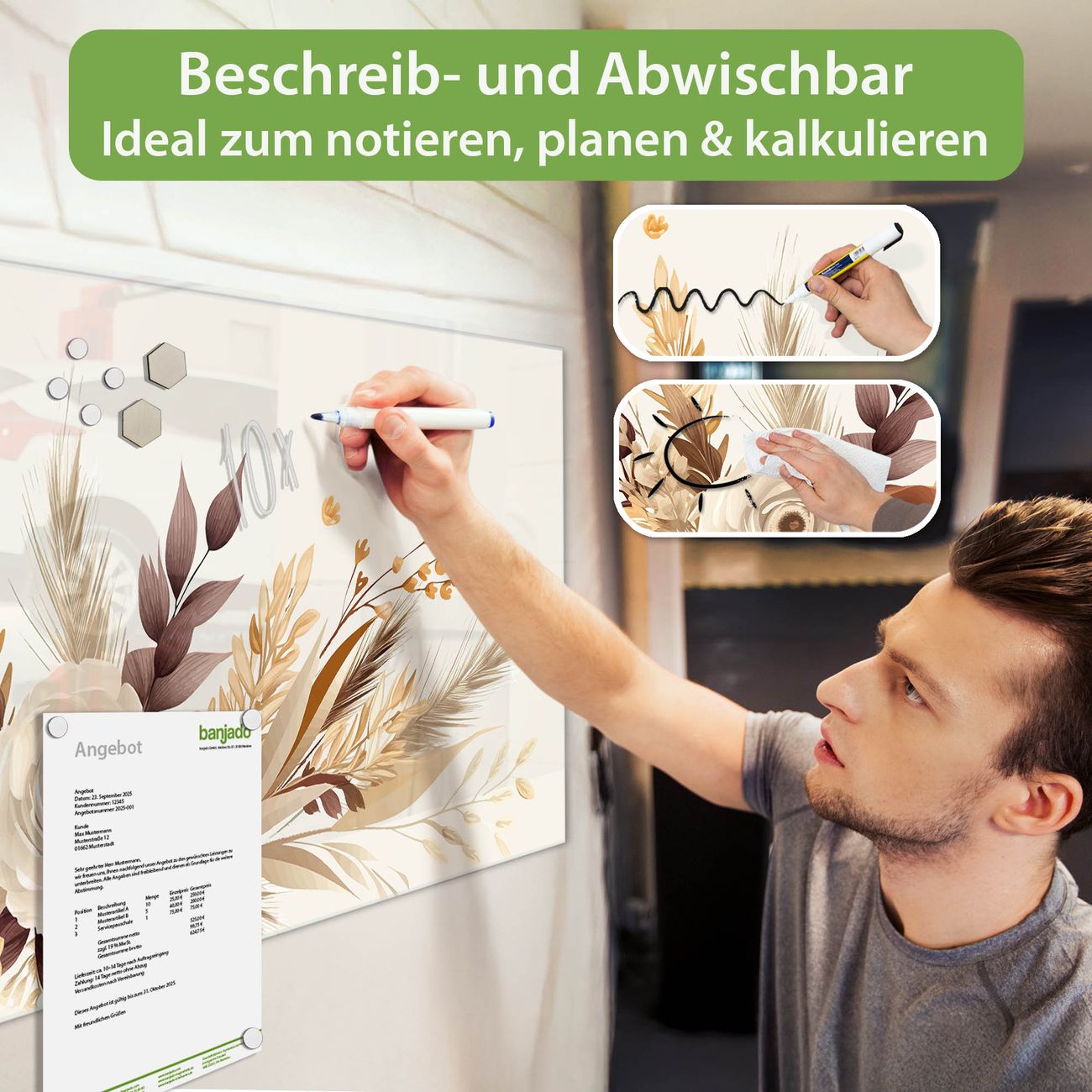 Jede Glas Magnettafel wird in unserer Werkstatt von Hand gefertigt und sorgfältig geprüft. So erhalten Sie ein echtes Qualitätsprodukt, das Funktion und Ästhetik perfekt vereint.?? Warum banjado?