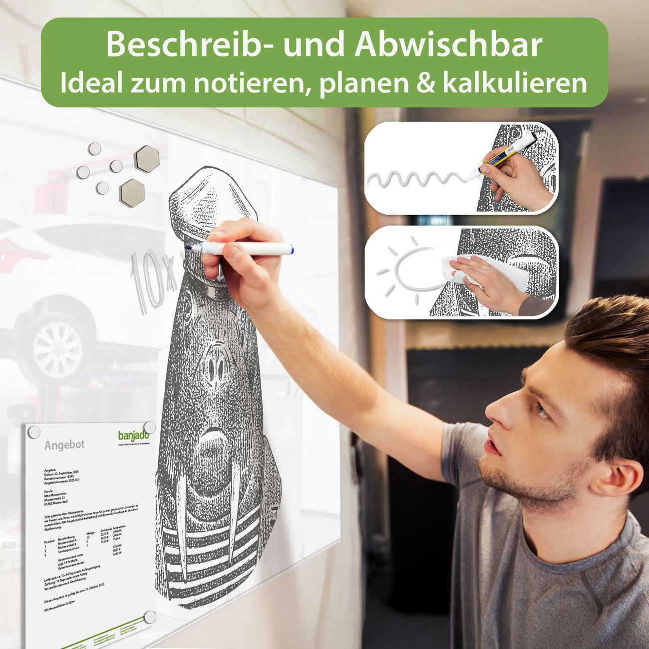 Jede Glas Magnettafel wird in unserer Werkstatt von Hand gefertigt und sorgfältig geprüft. So erhalten Sie ein echtes Qualitätsprodukt, das Funktion und Ästhetik perfekt vereint.?? Warum banjado?