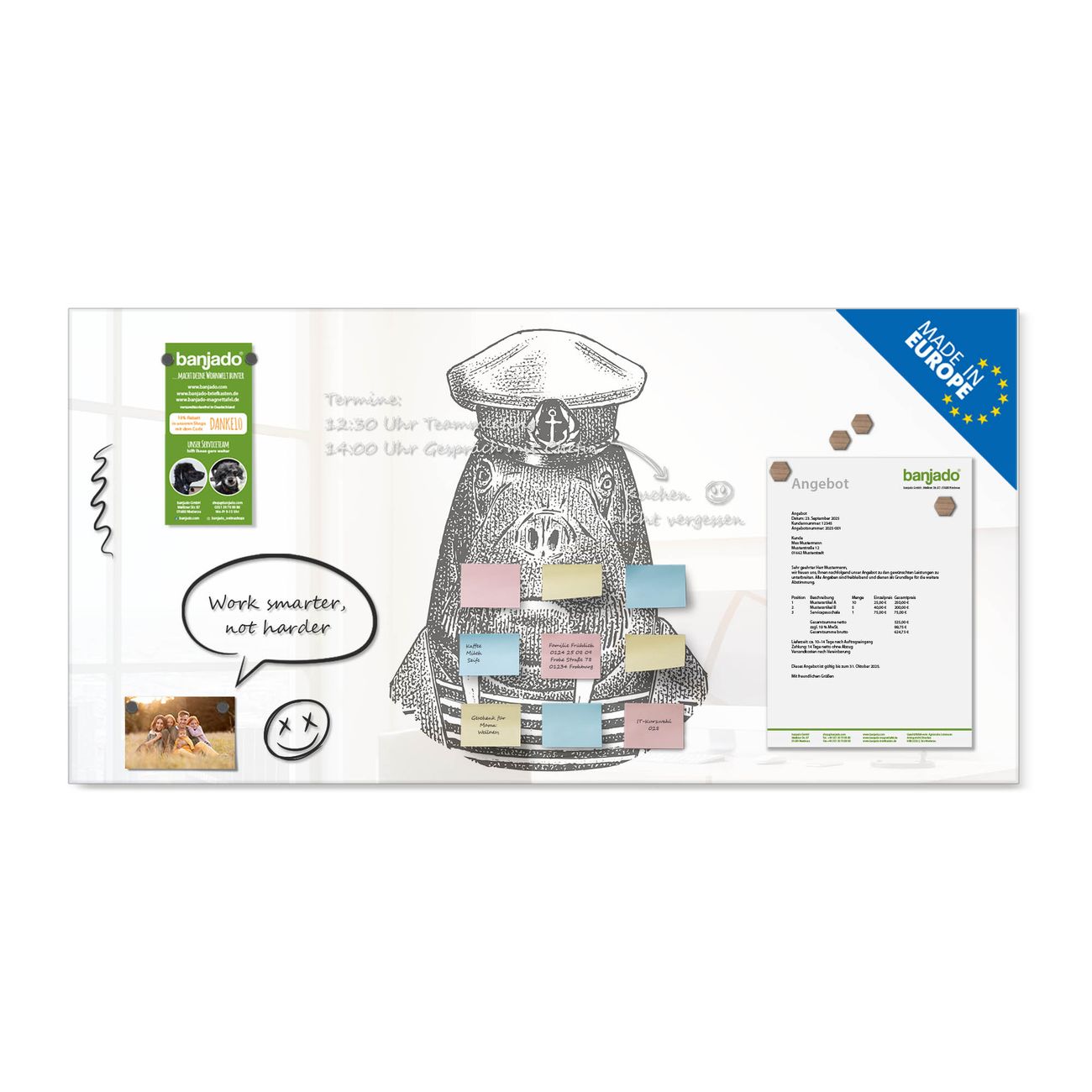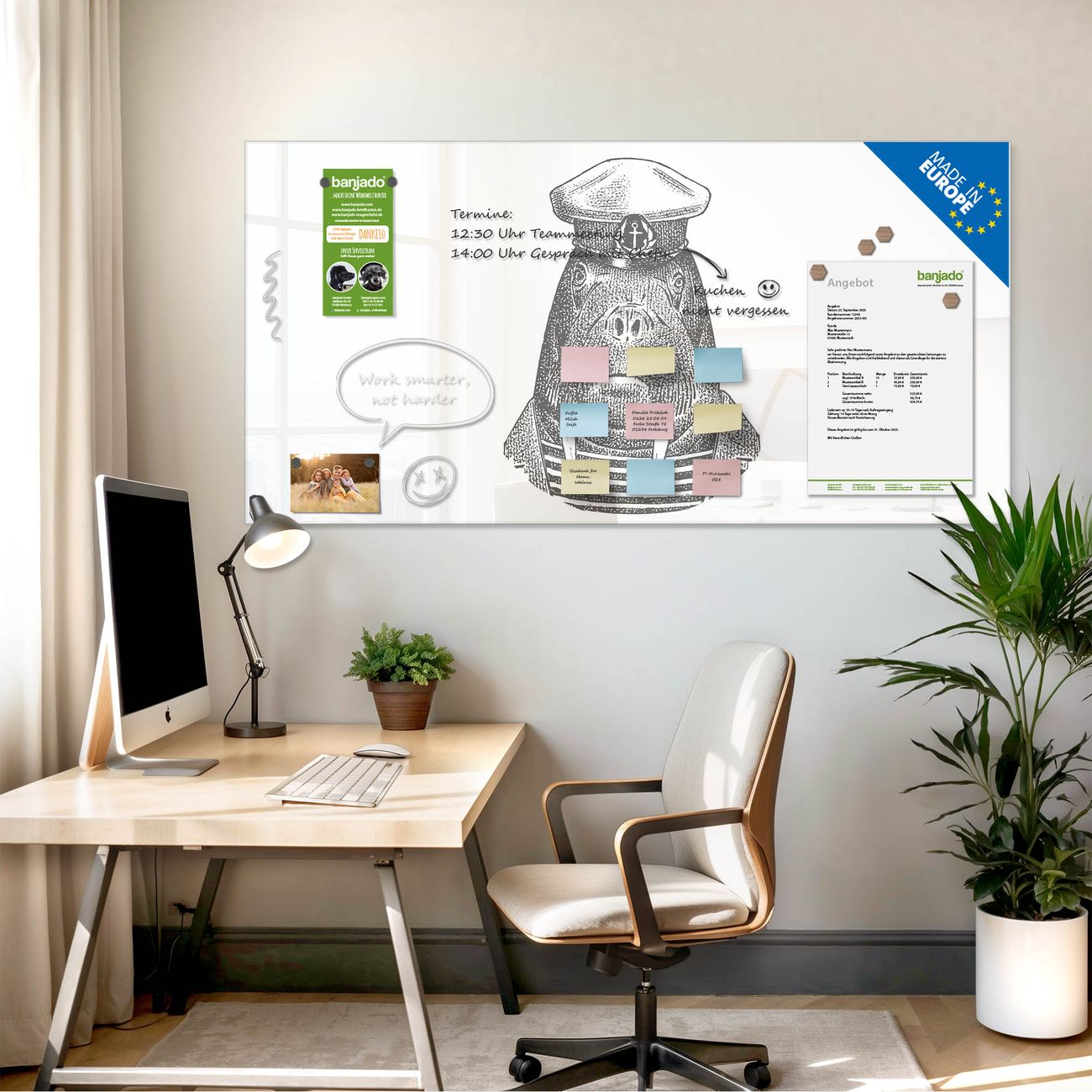 Jede Glas Magnettafel wird in unserer Werkstatt von Hand gefertigt und sorgfältig geprüft. So erhalten Sie ein echtes Qualitätsprodukt, das Funktion und Ästhetik perfekt vereint.?? Warum banjado?