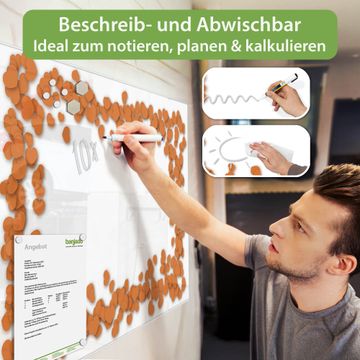 Auf der glatten Glasoberfläche lassen sich Termine, Rezepte oder Notizen ganz einfach mit Kreidestiften festhalten und rückstandslos entfernen. Starke Neodym-Magnete halten Ihre wichtigsten Erinnerungen sicher an Ort und Stelle. So entsteht Ihre ganz persönliche Ideenwand - jeden Tag neu.