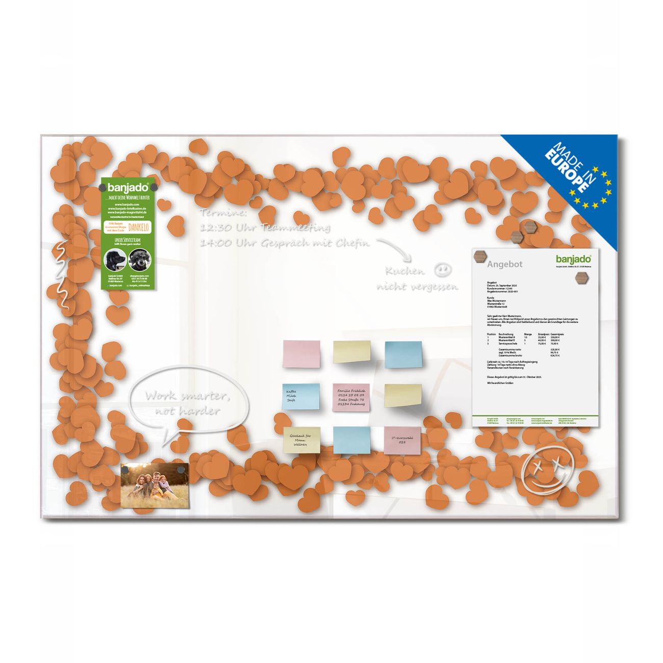 Ein Stück Design, das Ihren Alltag organisiert. Schreiben, heften, inspirieren - alles an einem Ort. Qualität, die man spürt. Montage leicht gemacht. Handwerk mit Herz - veredelt in Sachsen. Einzigartiges Design mit Motiv Motiv Herzrahmen in Orange Beschreibbare Glasoberfläche, leicht zu reinigen Starke Magnetkraft durch Stahlrückwand Inklusive 4 Neodym-Magneten Flexible Montageoptionen Handveredelt in Sachsen - Qualität, die bleibt
