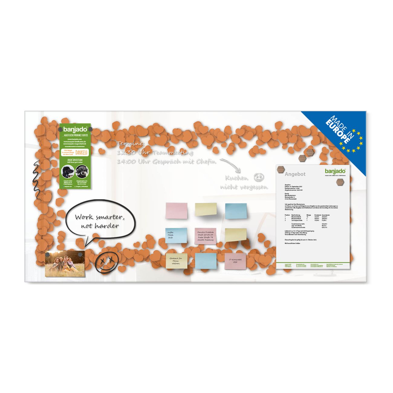 Ein Stück Design, das Ihren Alltag organisiert. Schreiben, heften, inspirieren - alles an einem Ort. Qualität, die man spürt. Montage leicht gemacht. Handwerk mit Herz - veredelt in Sachsen. Einzigartiges Design mit Motiv Motiv Herzrahmen in Orange Beschreibbare Glasoberfläche, leicht zu reinigen Starke Magnetkraft durch Stahlrückwand Inklusive 4 Neodym-Magneten Flexible Montageoptionen Handveredelt in Sachsen - Qualität, die bleibt