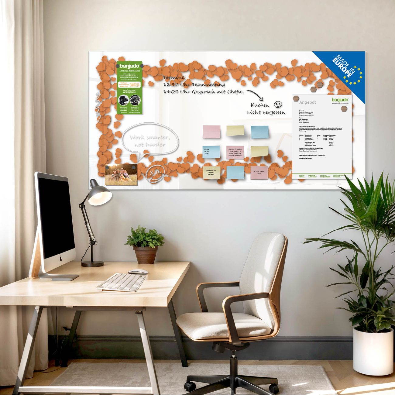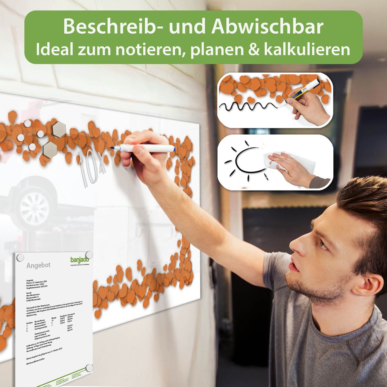 Jede Glas Magnettafel wird in unserer Werkstatt von Hand gefertigt und sorgfältig geprüft. So erhalten Sie ein echtes Qualitätsprodukt, das Funktion und Ästhetik perfekt vereint.?? Warum banjado?
