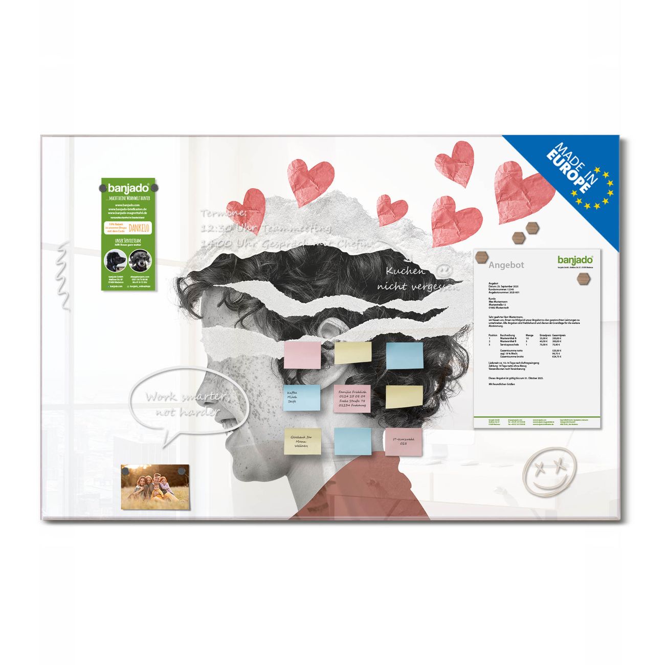 Jede Glas Magnettafel wird in unserer Werkstatt von Hand gefertigt und sorgfältig geprüft. So erhalten Sie ein echtes Qualitätsprodukt, das Funktion und Ästhetik perfekt vereint.?? Warum banjado?