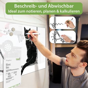 Auf der glatten Glasoberfläche lassen sich Termine, Rezepte oder Notizen ganz einfach mit Kreidestiften festhalten und rückstandslos entfernen. Starke Neodym-Magnete halten Ihre wichtigsten Erinnerungen sicher an Ort und Stelle. So entsteht Ihre ganz persönliche Ideenwand - jeden Tag neu.