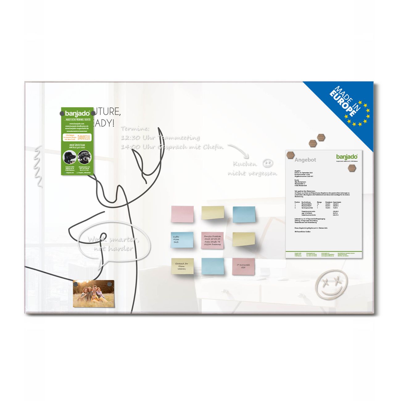 Jede Glas Magnettafel wird in unserer Werkstatt von Hand gefertigt und sorgfältig geprüft. So erhalten Sie ein echtes Qualitätsprodukt, das Funktion und Ästhetik perfekt vereint.?? Warum banjado?