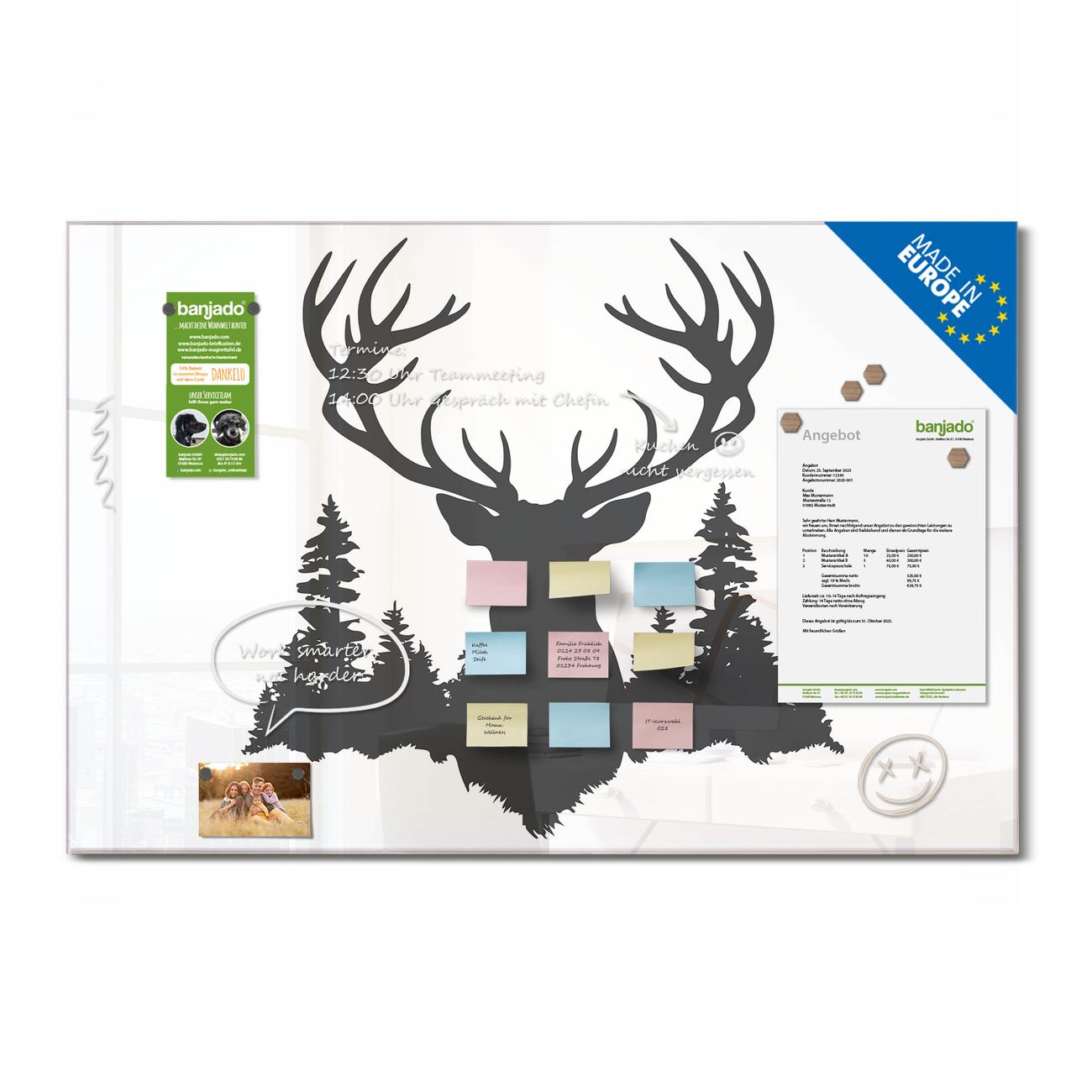 Ein Stück Design, das Ihren Alltag organisiert. Schreiben, heften, inspirieren - alles an einem Ort. Qualität, die man spürt. Montage leicht gemacht. Handwerk mit Herz - veredelt in Sachsen. Einzigartiges Design mit Motiv Motiv Hirsch im Wald Beschreibbare Glasoberfläche, leicht zu reinigen Starke Magnetkraft durch Stahlrückwand Inklusive 4 Neodym-Magneten Flexible Montageoptionen Handveredelt in Sachsen - Qualität, die bleibt