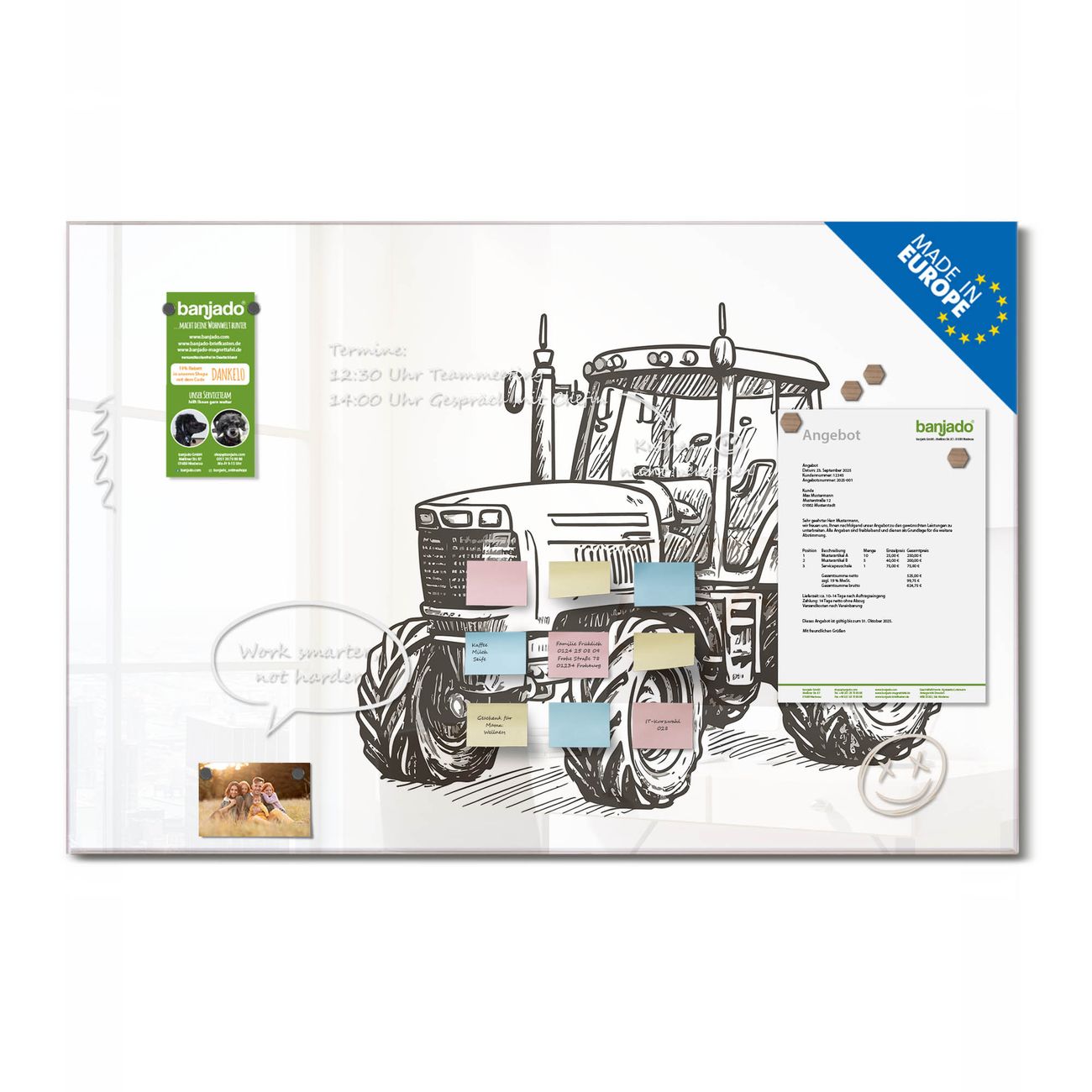 Ein Stück Design, das Ihren Alltag organisiert. Schreiben, heften, inspirieren - alles an einem Ort. Qualität, die man spürt. Montage leicht gemacht. Handwerk mit Herz - veredelt in Sachsen. Einzigartiges Design mit Motiv Motiv Historischer Traktor Beschreibbare Glasoberfläche, leicht zu reinigen Starke Magnetkraft durch Stahlrückwand Inklusive 4 Neodym-Magneten Flexible Montageoptionen Handveredelt in Sachsen - Qualität, die bleibt