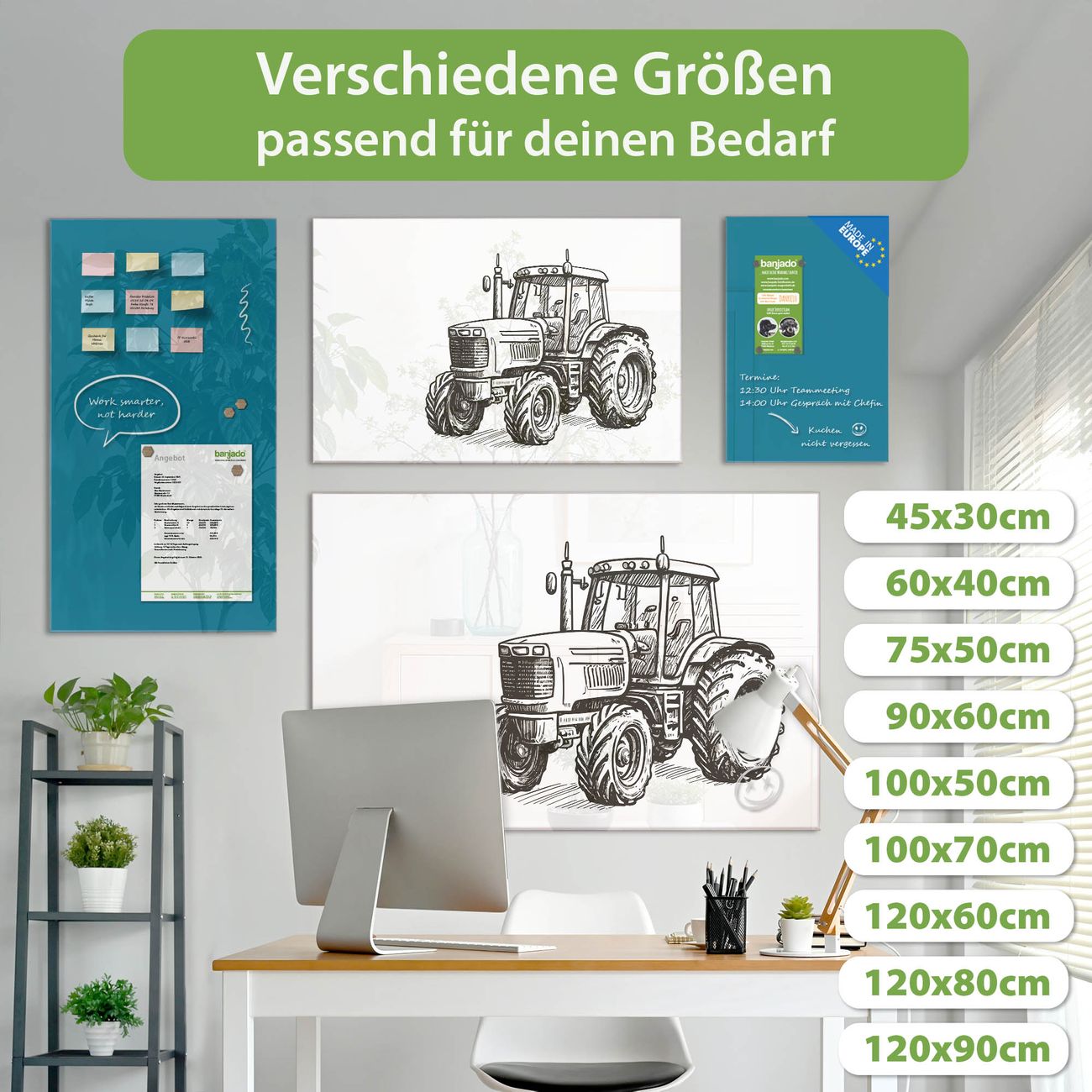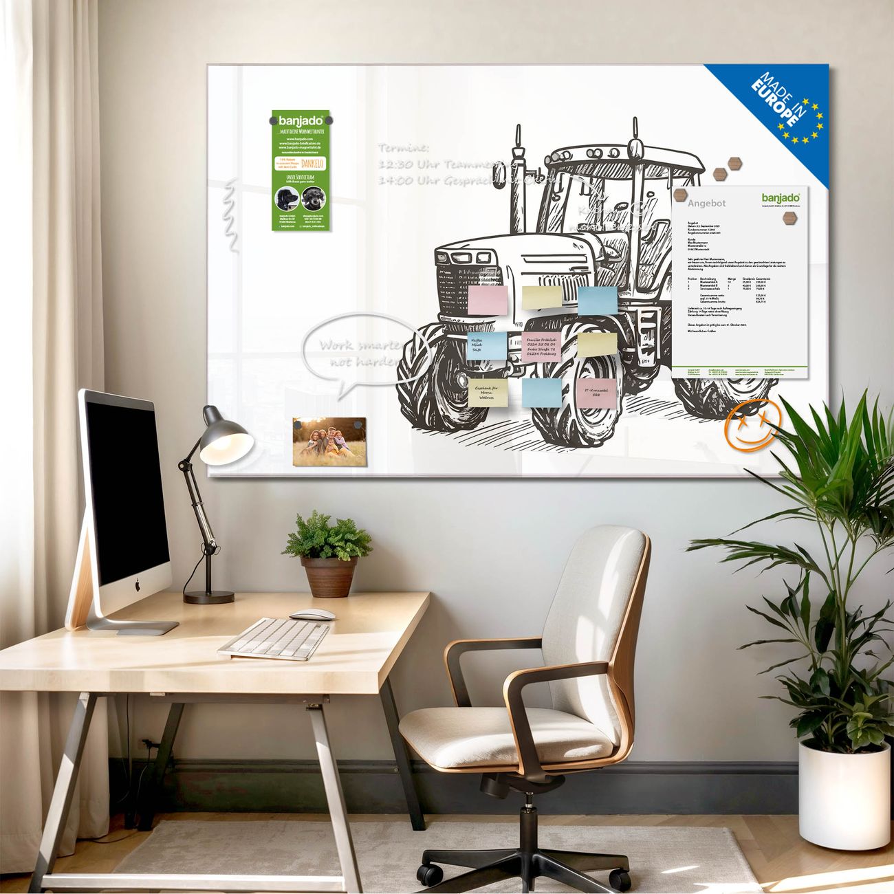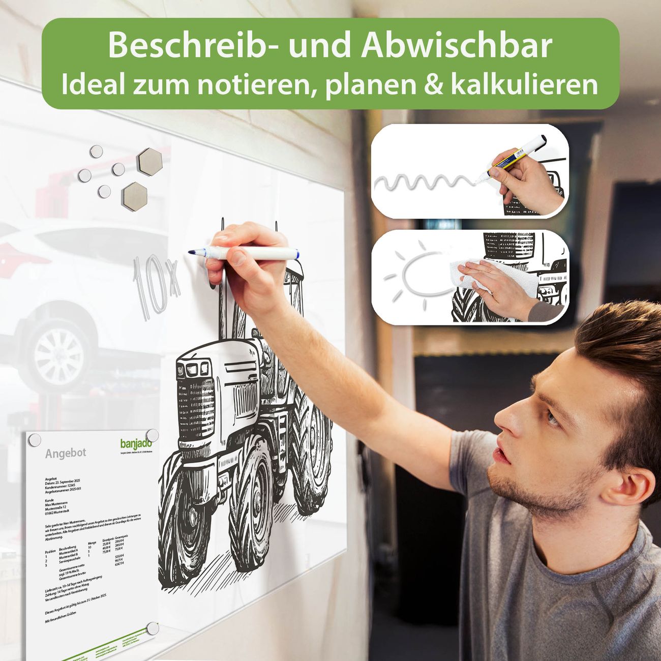 Jede Glas Magnettafel wird in unserer Werkstatt von Hand gefertigt und sorgfältig geprüft. So erhalten Sie ein echtes Qualitätsprodukt, das Funktion und Ästhetik perfekt vereint.?? Warum banjado?