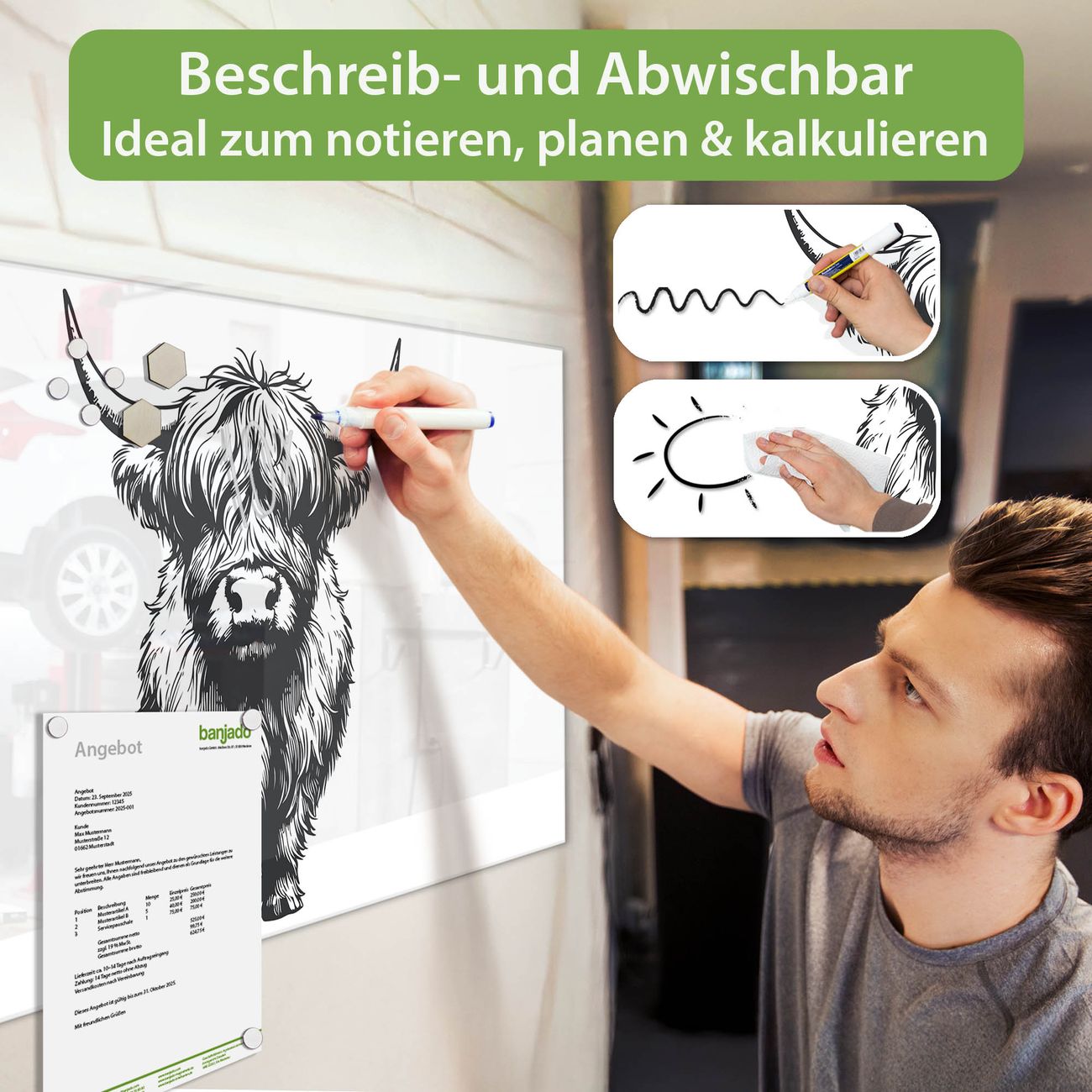 Die banjado Glas Magnettafel mit dem Motiv Motiv Hochlandrind verbindet Funktionalität mit Stil. Sie ersetzt das Zettelchaos durch klare Strukturen und bringt dabei eine warme, natürliche Atmosphäre in Ihr Zuhause. Ob im Büro, in der Küche oder im Eingangsbereich - dieses Design-Board zieht Blicke an und sorgt für Ordnung mit Charakter.