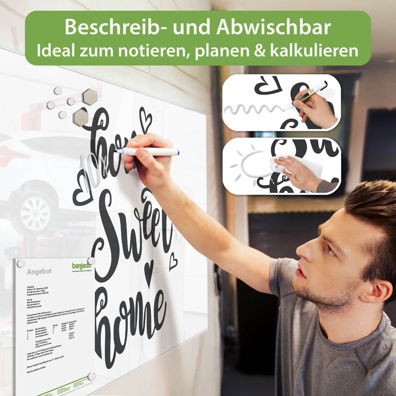 Jede Glas Magnettafel wird in unserer Werkstatt von Hand gefertigt und sorgfältig geprüft. So erhalten Sie ein echtes Qualitätsprodukt, das Funktion und Ästhetik perfekt vereint.?? Warum banjado?