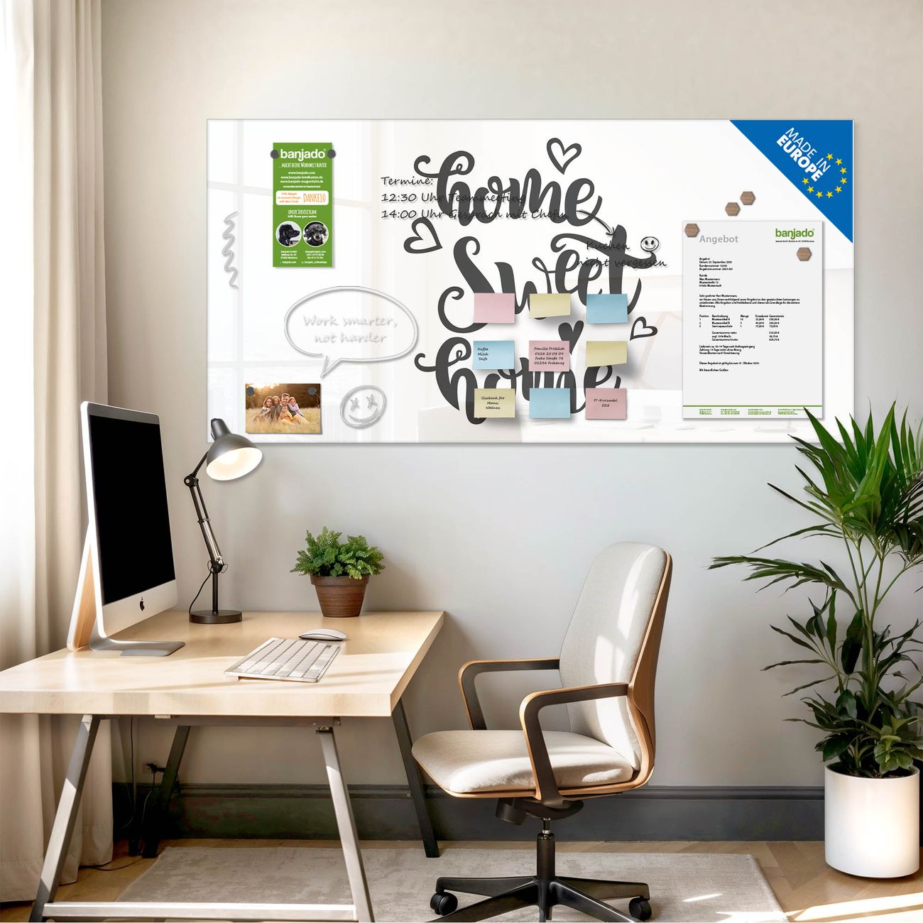 Jede Glas Magnettafel wird in unserer Werkstatt von Hand gefertigt und sorgfältig geprüft. So erhalten Sie ein echtes Qualitätsprodukt, das Funktion und Ästhetik perfekt vereint.?? Warum banjado?
