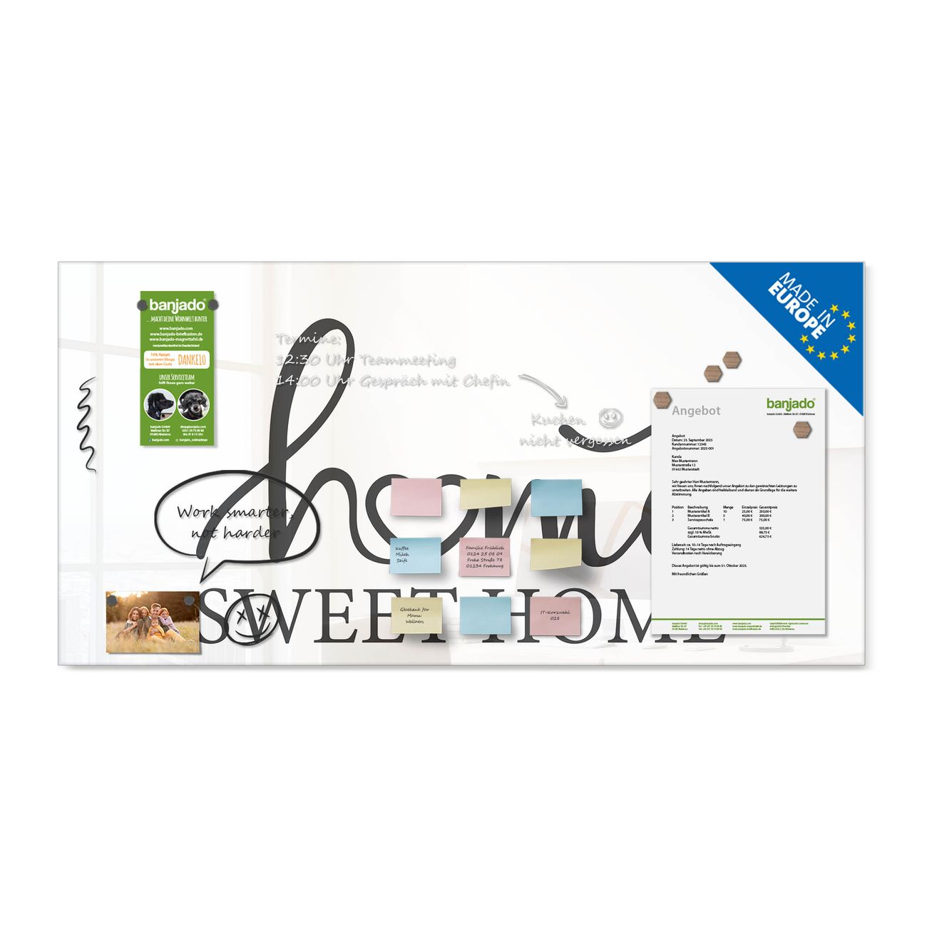 Jede Glas Magnettafel wird in unserer Werkstatt von Hand gefertigt und sorgfältig geprüft. So erhalten Sie ein echtes Qualitätsprodukt, das Funktion und Ästhetik perfekt vereint.?? Warum banjado?