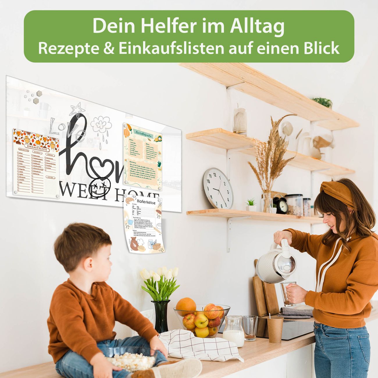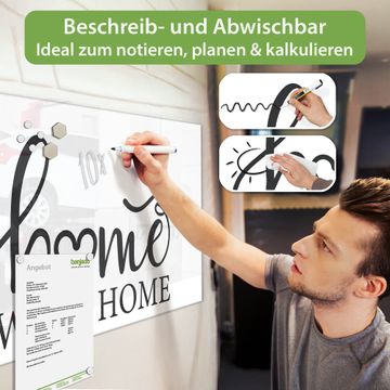 Auf der glatten Glasoberfläche lassen sich Termine, Rezepte oder Notizen ganz einfach mit Kreidestiften festhalten und rückstandslos entfernen. Starke Neodym-Magnete halten Ihre wichtigsten Erinnerungen sicher an Ort und Stelle. So entsteht Ihre ganz persönliche Ideenwand - jeden Tag neu.