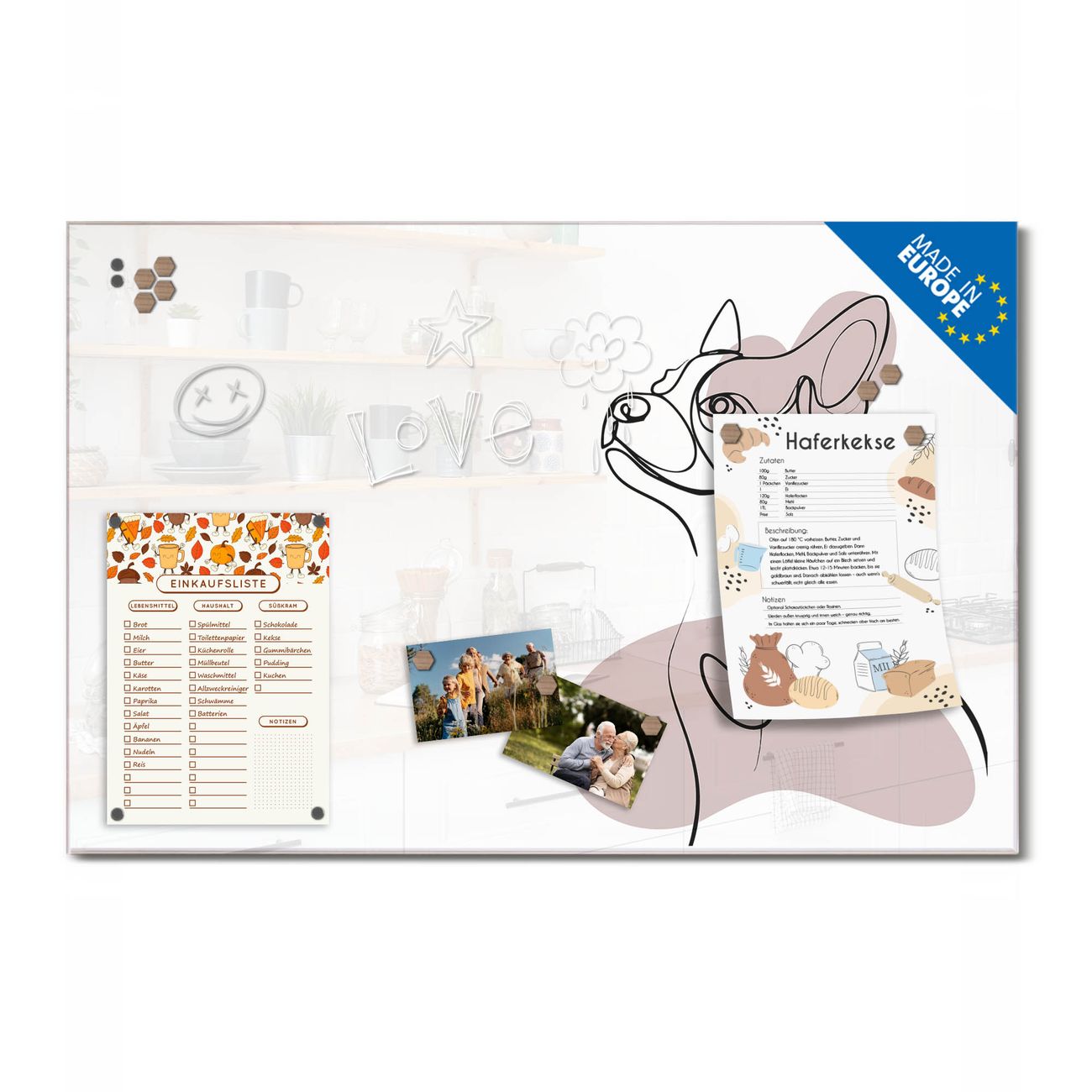 Ein Stück Design, das Ihren Alltag organisiert. Schreiben, heften, inspirieren - alles an einem Ort. Qualität, die man spürt. Montage leicht gemacht. Handwerk mit Herz - veredelt in Sachsen. Einzigartiges Design mit Motiv Motiv Hundeporträt Beschreibbare Glasoberfläche, leicht zu reinigen Starke Magnetkraft durch Stahlrückwand Inklusive 4 Neodym-Magneten Flexible Montageoptionen Handveredelt in Sachsen - Qualität, die bleibt